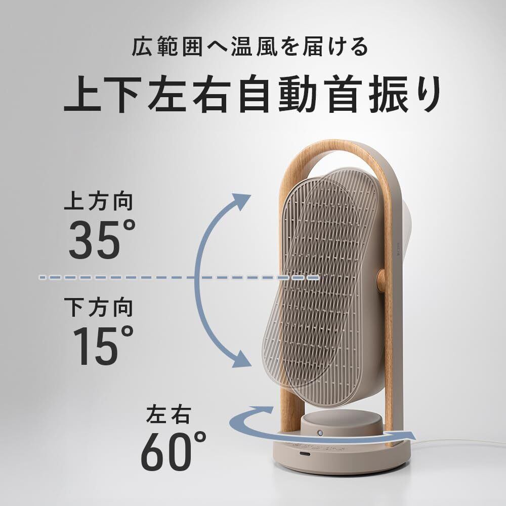 木目調のおしゃれなデザインヒーター。自動首振り(上方向35°、下方向15°、左右60°)機能付きで部屋全体を温めてくれます。