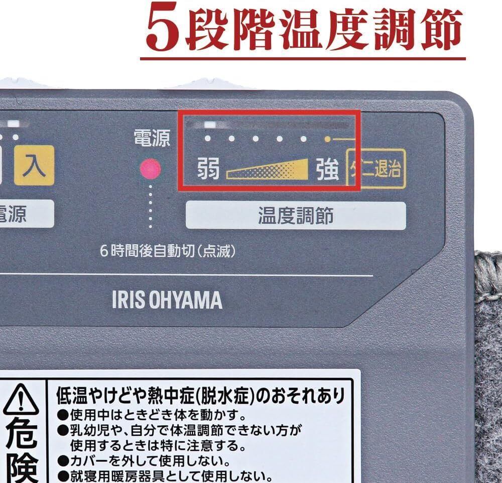 5段階の温度調節機能を搭載しているため、必要に応じて温度を自由に選べます。お好みの温かさを選び、快適な環境を維持することができます。自動電源オフ機能が6時間設定されているので、うっかり消し忘れてしまった際も安心です。