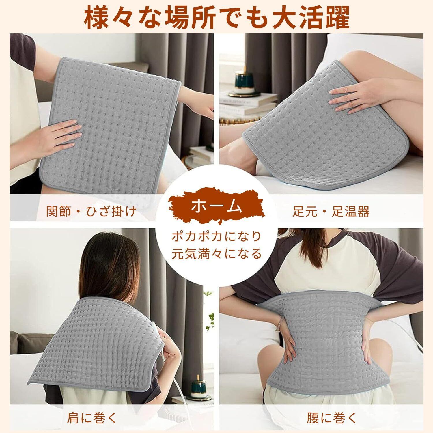 【多用途】 ご自宅、オフィス、学校、車内、アウトドア、出張などたくさんの場所で使えます。背中、首、肩、腹部、もも、すねや腕に適用されます。注意:ホットマットの上に座らないでください。0 ~ 3歳児使用禁止。