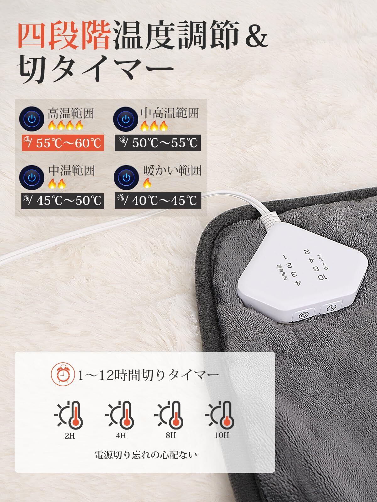 【4段階温度調整・2-10Hタイマー】電気カーペットはボタンを押すだけの簡単操作で、お好みやシーンに合わせて、4段階の温度(45℃、50℃、55℃、60℃)からお選びいただけます。就寝時やリラックスタイムには、2時間から10時間まで(2時間、4時間、8時間、10時間)お選びいただけるタイマー機能で、つけっぱなしのうっかりも安心。これらすべてが、付属のコントローラーボタン操作だけで、とっても簡単に実現できます。 お好みの温もりを、必要な時間だけ、がっちりサポートします。