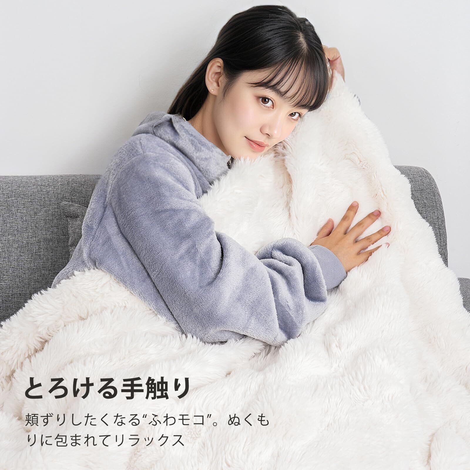 【見た目よし、触れてもっとよし】表:ラビットファー調ロングパイル×ポコポコの立体感。裏:高密フランネルのしっとり。指先がするんと沈み、ふわとろに戻る。電源OFFでも一級のブランケット映え。