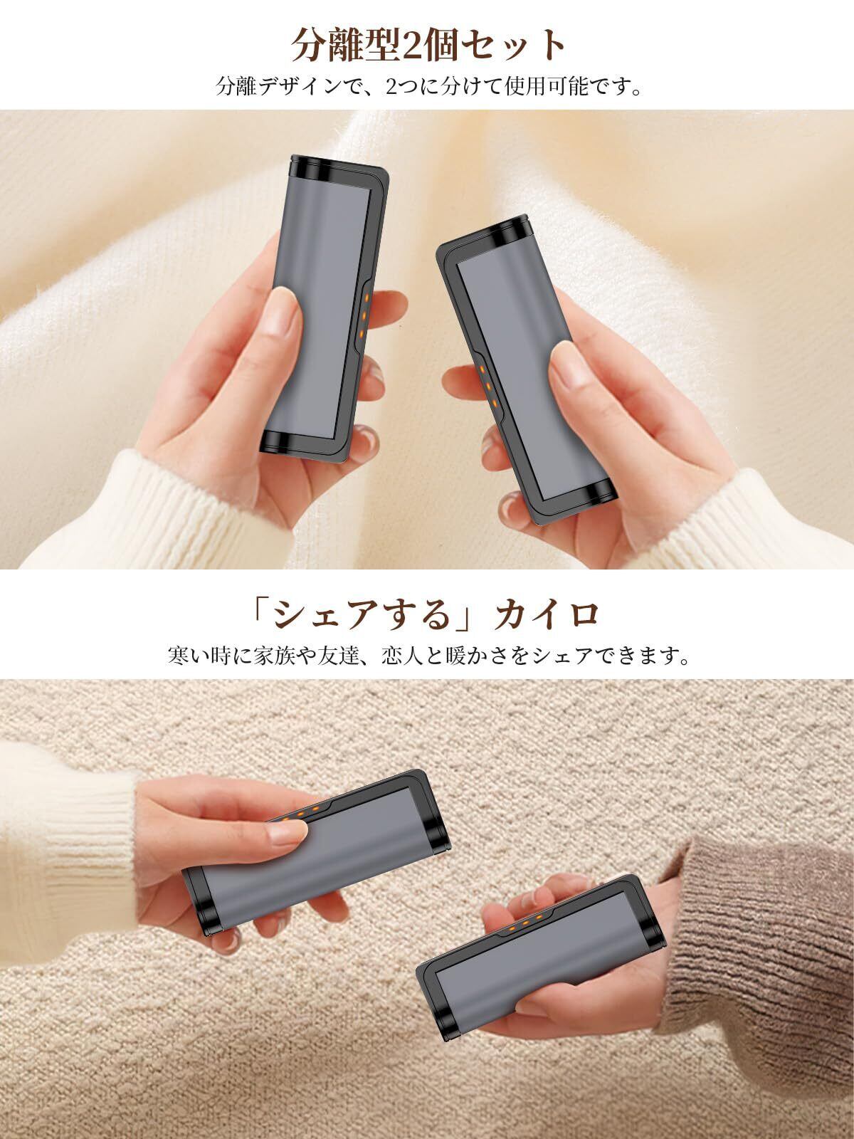 【分離式デザイン式・ペアでワンセット】分離式な充電式カイロは実現した!一つは手を暖めながら、もう一つは他のデバイスを充電することもできる。また、外出時に左右の手を別々に暖められるほか、片方だけ持ち歩いて荷物がかさばっても握りやすい。寒い冬に手足を温めてくれ、暖かさをもたらします。長時間お待たせなく、いつでもどこでも優しい温もりを与えてくれます。冷え性の方や寒さに弱い方が冬を快適に過ごすために最適な防寒グッズです。