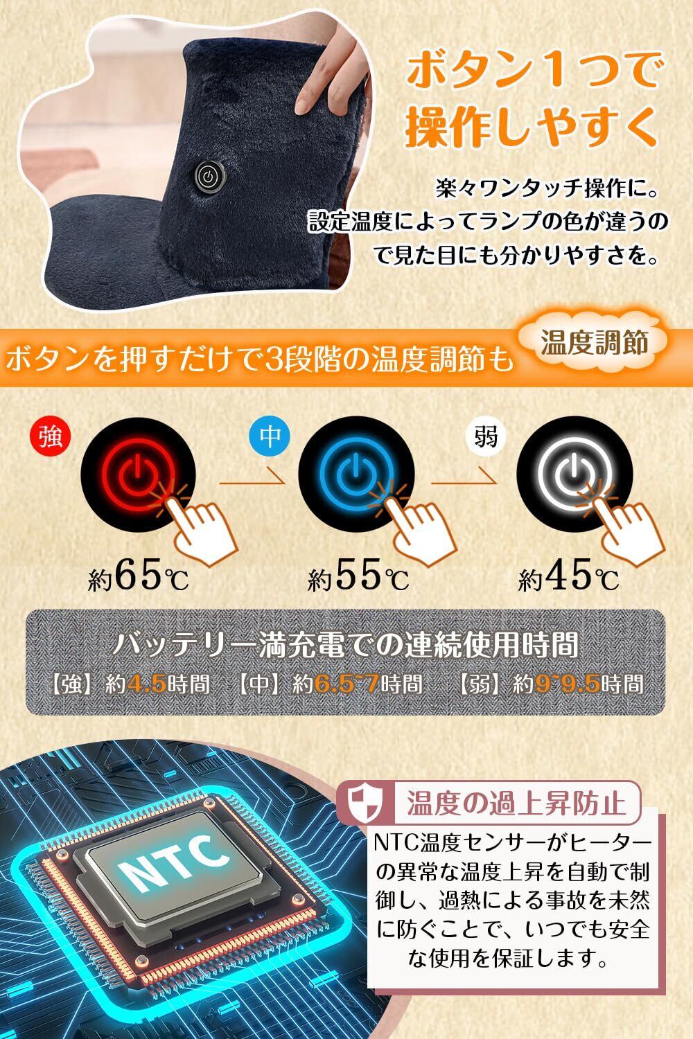 ➤ 特徴:両面発熱、NTC過熱保護、コードレス、洗濯可能、滑り止め