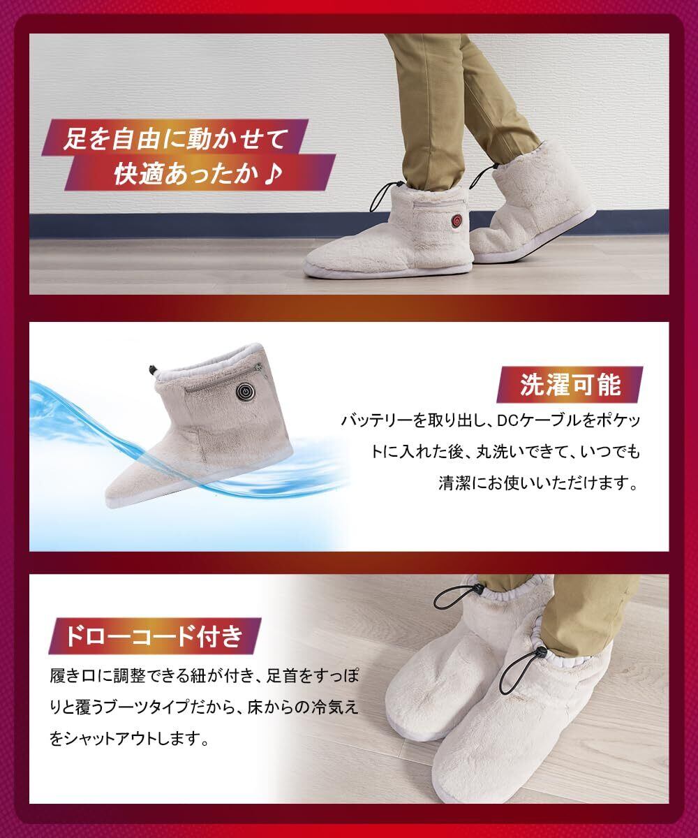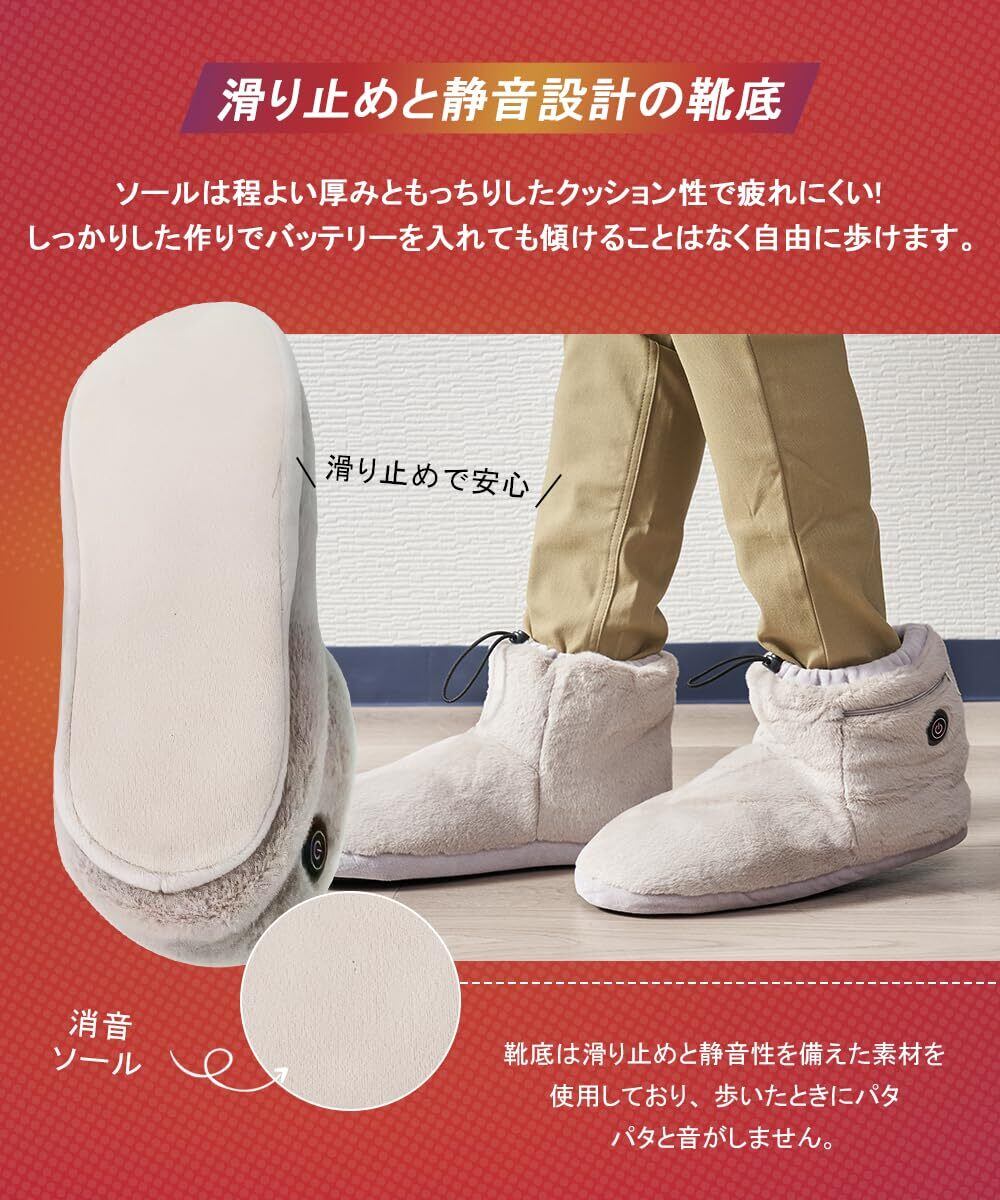【静音設計&洗濯可能】アップグレードされた靴底は静音素材で、衝撃を吸収してくれるため、足音を軽減し、歩いたときにパタパタと音がしません。不快な音がなし、フローリングの床も傷つけないの室内スリッパです。更に丸洗いできて、いつでも清潔にお使いいただけます。(洗濯前にバッテリーを取り出して、本体にあるDCケーブルをカバーしてポケットに入れ、ファスナーを締めてください。)