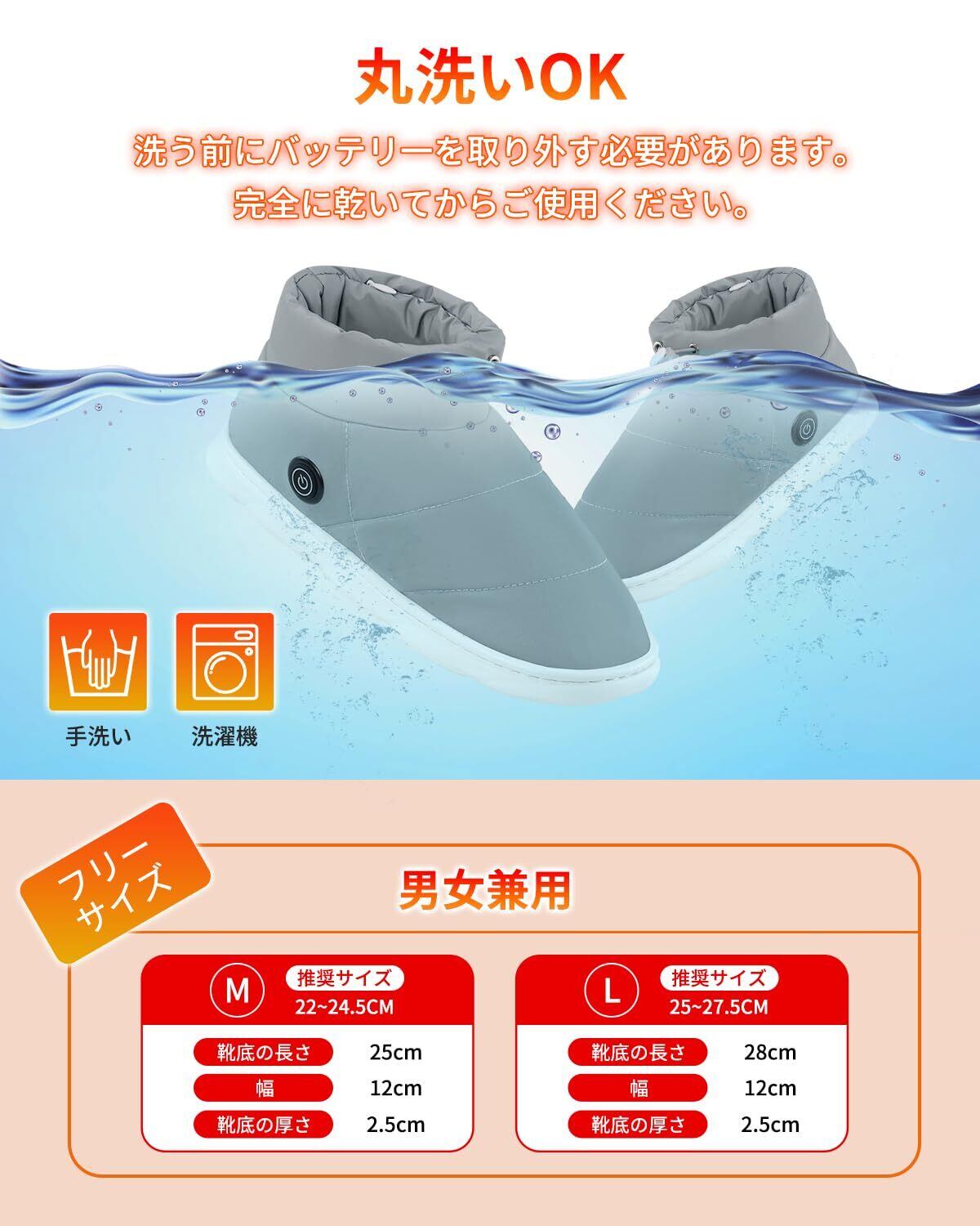 【男女兼用&丸洗いOK&様々な場面に大活躍】Barkyo歩き回れる電気足温器はMサイズ(22~25CM)、Lサイズ(25~28CM)二つ対応可能です。(秋冬用の靴下は厚めのつくりが多いので、普段よりもワンサイズ大きめを検討してみましょう)コードレスので足を自由に動かせてリラックスできます。テレワーク中にしっかり暖をとる目的はもちろん、家事などで部屋全体を歩き回るシーンにも活躍!暖かいルームシューズで、プレゼントにもおすすめです。