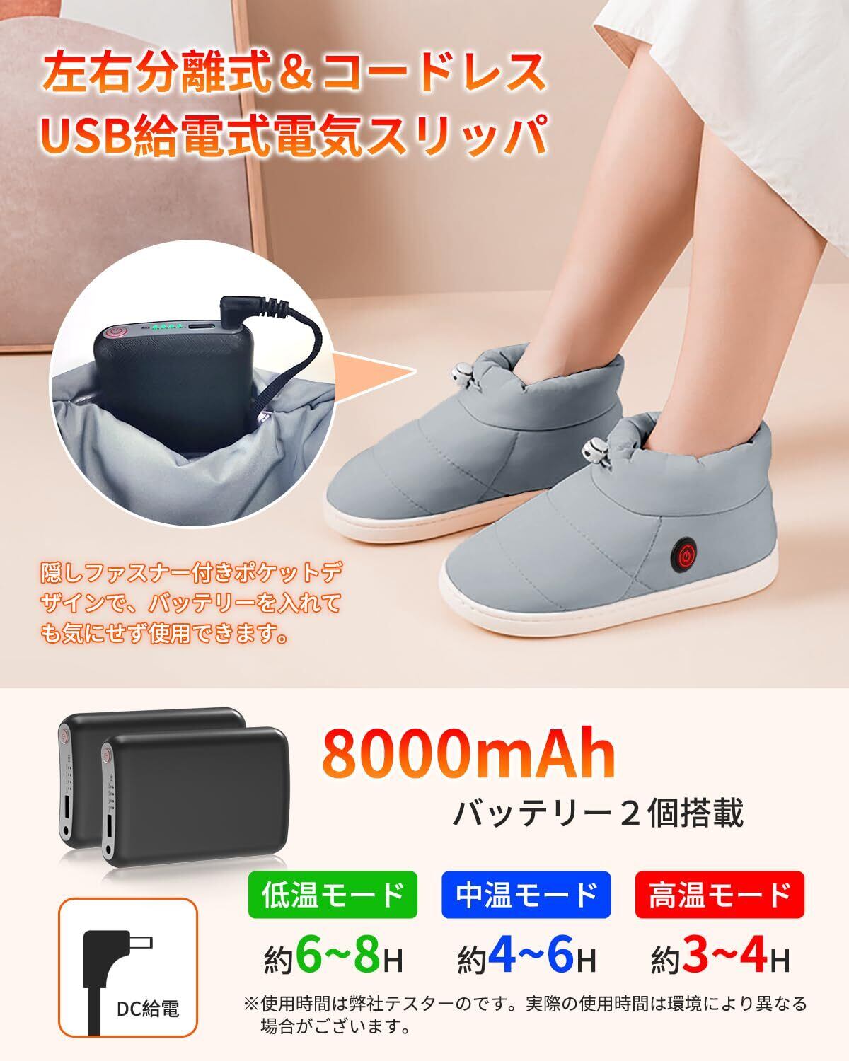 【数量限定】電気スリッパ コードレス【2個8000mAhバッテリー付き・3秒で速暖・2025新登場】フットウォーマー 歩き回れる 3段階温度調節 両面発熱 日本製ヒーター ポカポカ 軽量 撥水加工 男女兼用 電気足温器 暖房器具 足首まで包み込む 滑り止め 日本語説明書 洗濯可 省エネ 防寒対策 足冷え対策 フリーサイズ プレゼント (グレー, L)