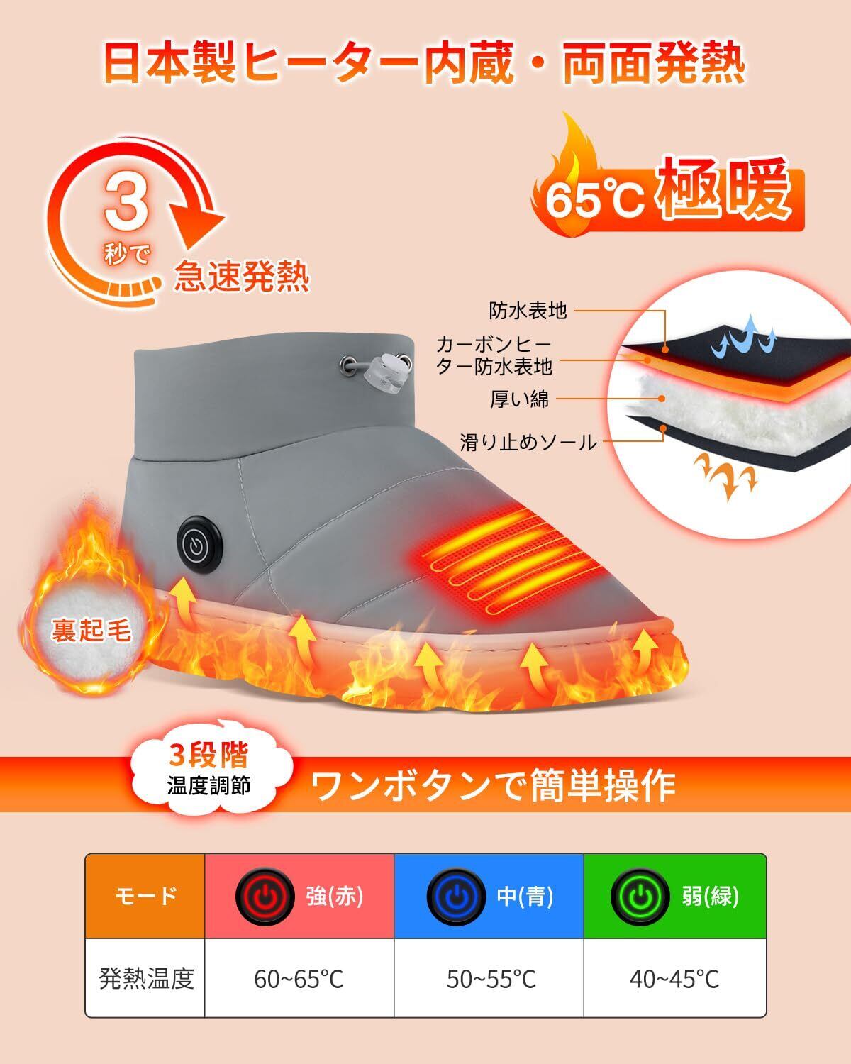 【3段階温度調節&ワンボタン操作&滑り止め】 電気スリッパは40〜65℃まで、細かく3段階の調節が可能です。ほとんどの温度需要を満たします。低温から高温まで幅広い温度の調節ができるのでお好みや周囲の環境に応じて自由に選択できます。高温モード65℃(赤ランプ)、中温モード55℃(青ランプ)、低温モード45℃(緑ランプ)。足元から身体まで暖かくポカポカに!コントローラーはボタンが1つなので、簡単に操作できます。過熱や寒さを心配する必要がなく、省エネルギーで環境にも優しいです。寒さに弱い方にとっては、冬には不可欠なアイテムです。または、コードレス電気スリッパの底が約3.5CM厚め、快適な歩行のサポートに役立ちます。また、滑って転倒をしてしまわないよう、底面がEVA素材で滑りにくく作られた。