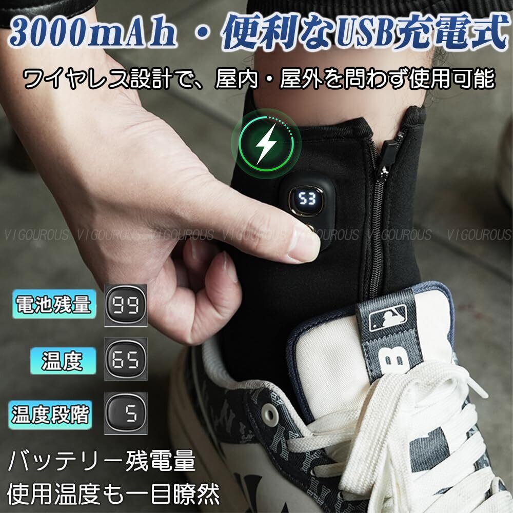 【在庫セール】【2025年 USB充電式&ワイヤレス設計】 電熱足温器 USB充電式 3000mAh 5段階発熱 最高温65℃ 電熱インソール ヒーター付き 発熱インソール 充電式 冬用 足温器 指なし靴下 足暖かく 電熱ウェア 防寒対策 男女兼用 75kg以内適用 足踝周り約24cm