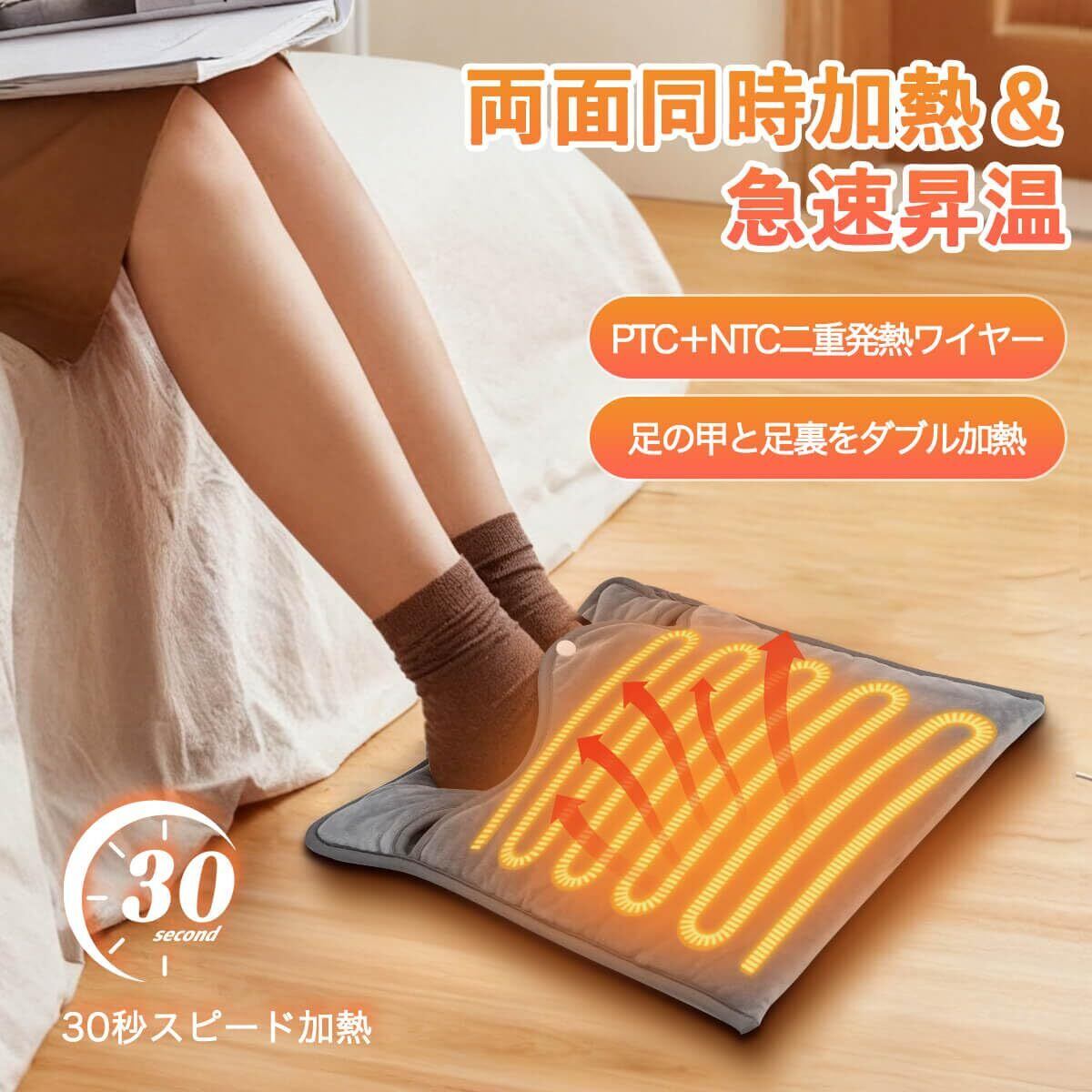 【両面速熱】フットウォーマーはPTC+NTC二重発熱ワイヤーを採用し、全方位加熱で足の甲と足裏をしっかり暖めます。30秒でスピード加熱!ボタン式開口で冷気をシャットアウトし、保温性も抜群です。寒い季節にぴったりの足元 あったかグッズ