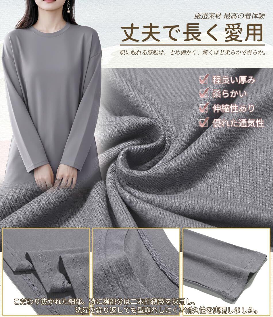 【着痩せ・小顔】上品なラウンドネックのデザインは、首元を美しく引き立て、顔周りに小顔効果を演出する長袖 Tシャツ。余分な贅肉を巧みにカバーし、ほどよい落ち感が洗練された印象に仕上げてくれて、自分らしく過ごせる毎日に。体型を選ばず、誰にでも似合う万能トップス。長時間の着用や頻繁な活動でも窮屈さや不快感を感じることなく、快適な着心地を提供してくれます。