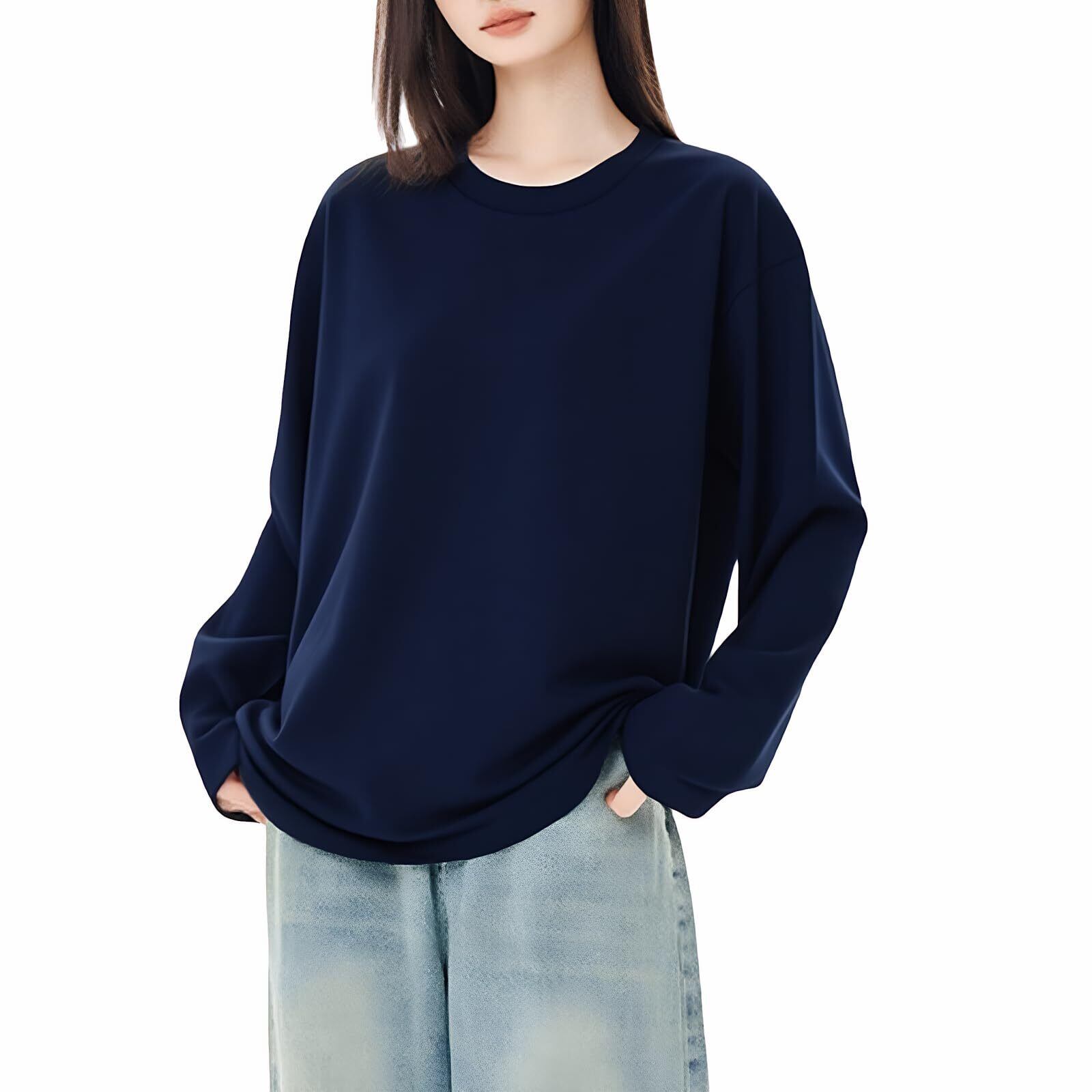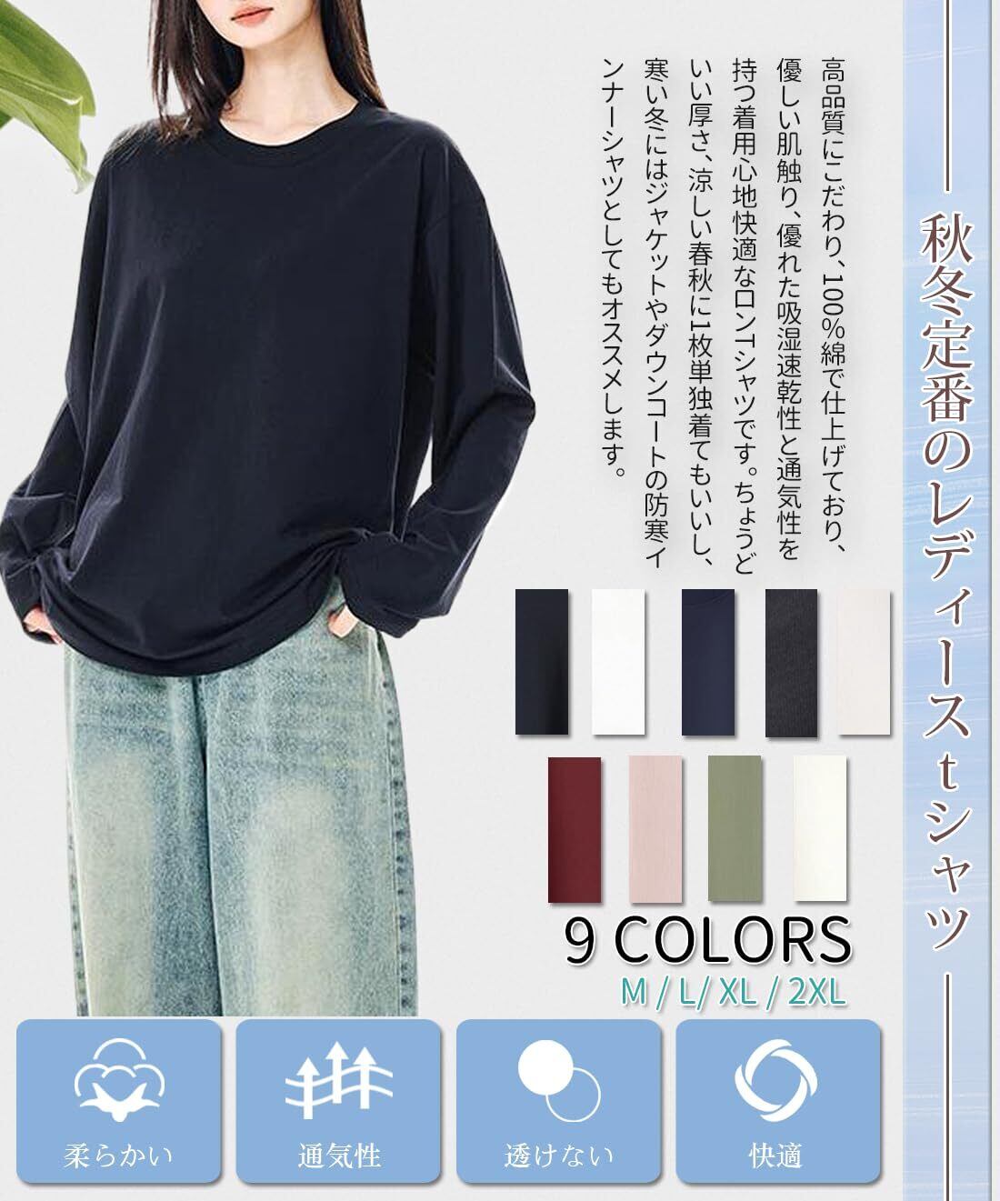 【秋冬定番!長袖 T シャツで小顔 & 快適保温両立】 肌寒い朝晩や室内での肌寒さ対策に最適な、軽量で保温性抜群の長袖 T シャツです クルーネック(丸首)デザインが首元をスッキリ演出し、小顔効果で顔周りを美しく見せる。 ゆとりのあるシルエットが「太ももが太い」「肩幅が気になる」といったお悩みをカバーし、リビングでくつろぐ時や買い物・散歩といった日常外出シーンで、寒い風を遮断しながら “着痩せ” スタイルを維持!