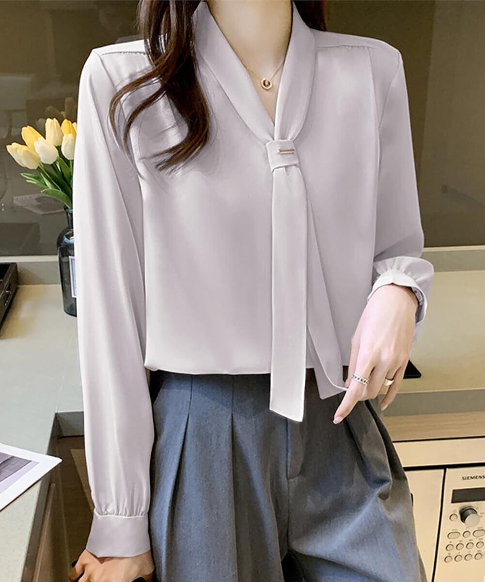 「[Yino] リボンブラウス」は、魅力的なボウタイデザインが特徴の長袖シャツです。Vネックとパフスリーブの組み合わせが、フェミニンな印象を与え、オフィスやデートなど様々なシーンで活躍します。シンプルながらも洗練されたスタイルを演出します。