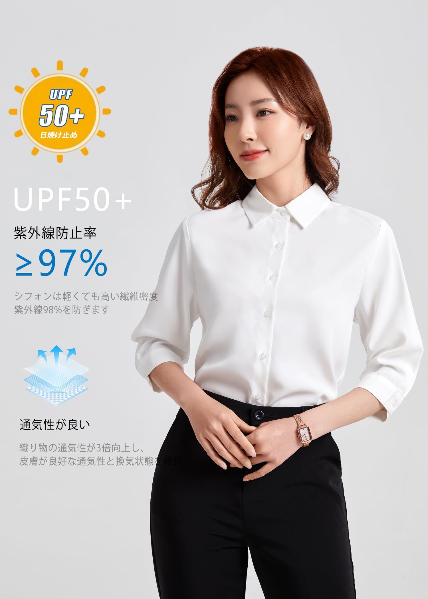 [Enmain] 新登場!101S「ドレープ感 」高通気 快適 柔らかい シフォン ブラウス UV防止 UPF50+ オフィス 事務服 通勤 就活 きれいめ ノーアイロン ワイシャツ レディース 七分袖 ゆったり/80番手