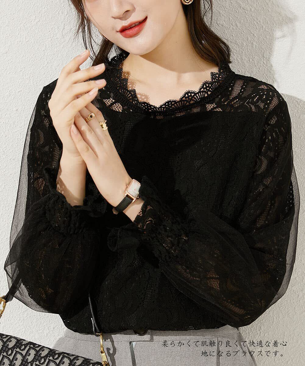 [Yino] (イノ) レース シャツ ブラウス レディース チュール トップス おしゃれ お洒落 大人 可愛い 着痩せ 長袖 フォーマル オフィス 通勤 OL 通学 きれいめ カジュアル 通気 春 夏 秋