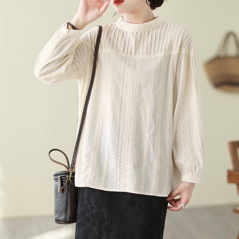 「[TRTRO] ブラウスシャツ」は、繊細なレースデザインとゆったりとしたシルエットが魅力の長袖ブラウスです。純色仕上げで、カジュアルなシーンからきれいめなスタイルまで幅広く対応。どんなシーンでもあなたの魅力を引き立てる一着です。