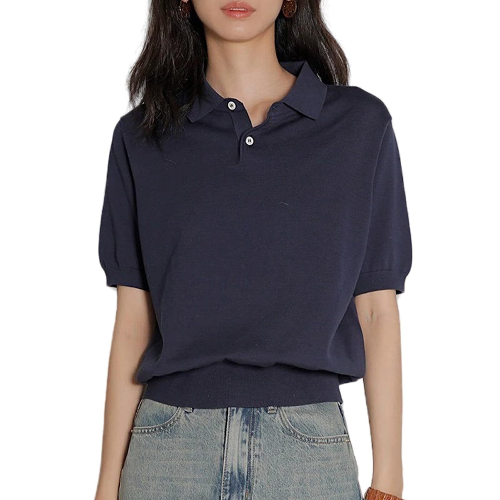 [Vmiutyer LLOP] サマーニット ポロシャツ レディース 半袖 透けにくい ストレッチ 襟付き tシャツ リプニット オフィス カジュアル おしゃれ ベーシック きれいめ トップス 夏