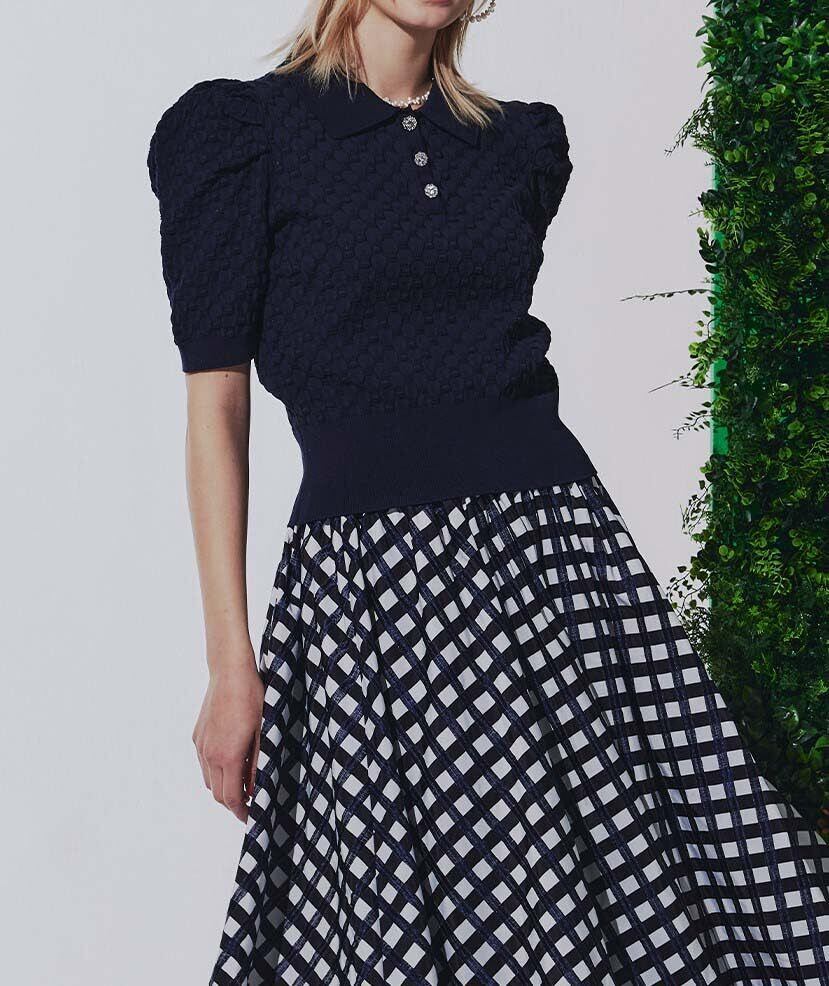 サマーコットンポリエステル糸を使用し、独自の編地を表現したニットポロ。さらっとしたタッチと通気性の良さで、暑い季節も快適に着用できます。華やかな印象を与えるパフスリーブと、胸元にきらめくボタンが、フェミニンな雰囲気を演出。コンパクトなシルエットで、ボリューム感のあるフレアスカートとの相性も抜群です。