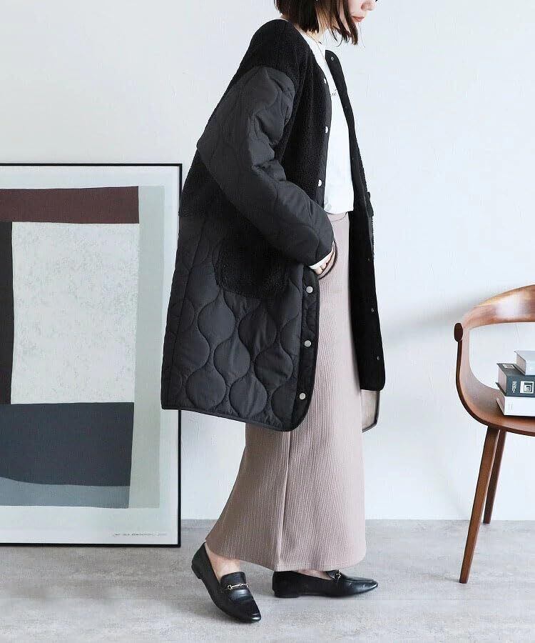 【在庫セール】[SPRING SEASON] キルティングコート レディース 切り替え 異素材ドッキング 軽量 ノーカラーコート ボア ロングコート 大きめ ゆったり 楽ちん 体型カバー 秋冬 防寒