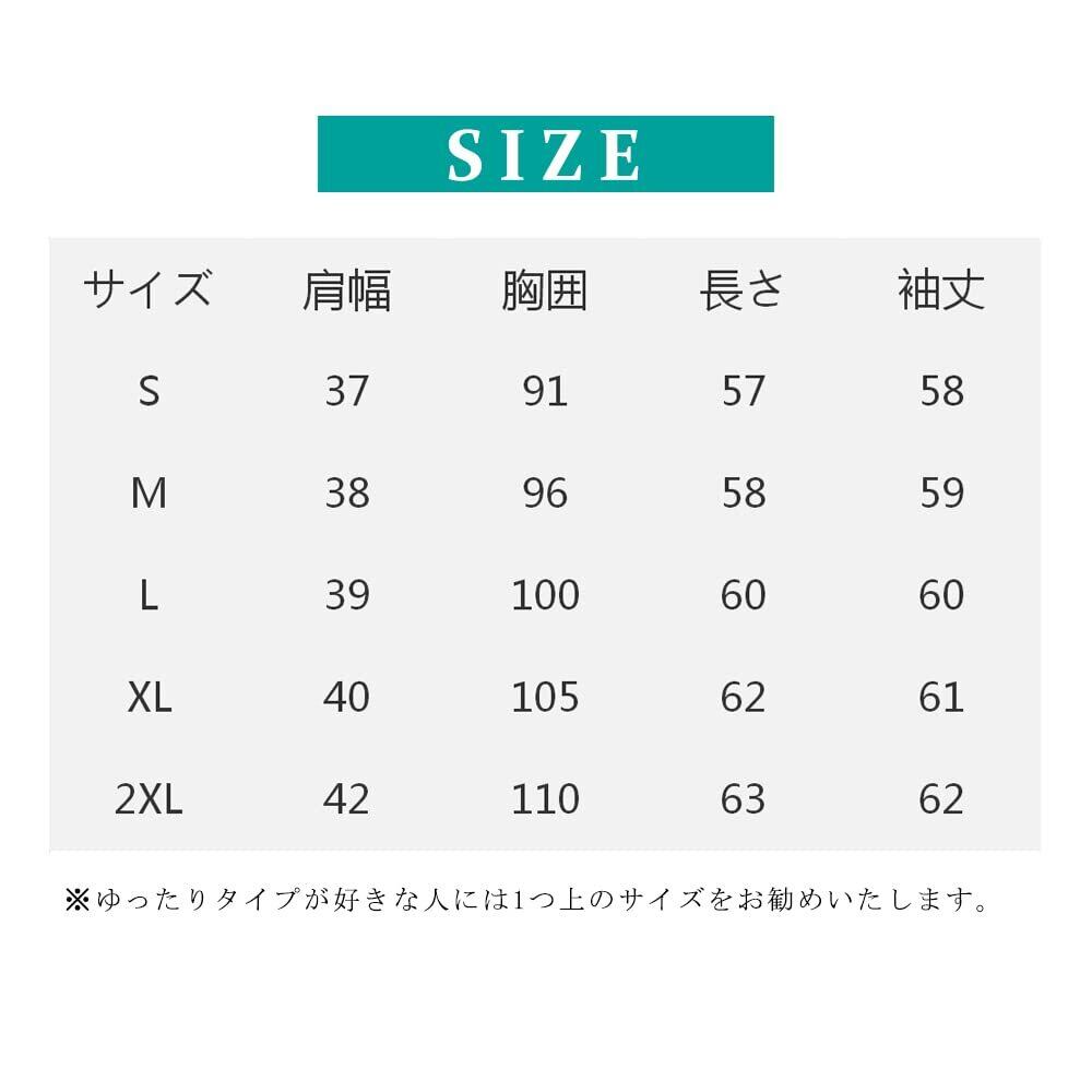 サイズ(cm): 【S】着丈:57 胸囲:91 肩幅:37 袖丈:58 【M】着丈:58 胸囲:96 肩幅:38 袖丈:59 【L】着丈: 61 胸囲:100 肩幅:39 袖丈:60 【XL】着丈:63 胸囲:105 肩幅:40 袖丈:61【2XL】着丈:62 胸囲:110 肩幅:42 袖丈:62