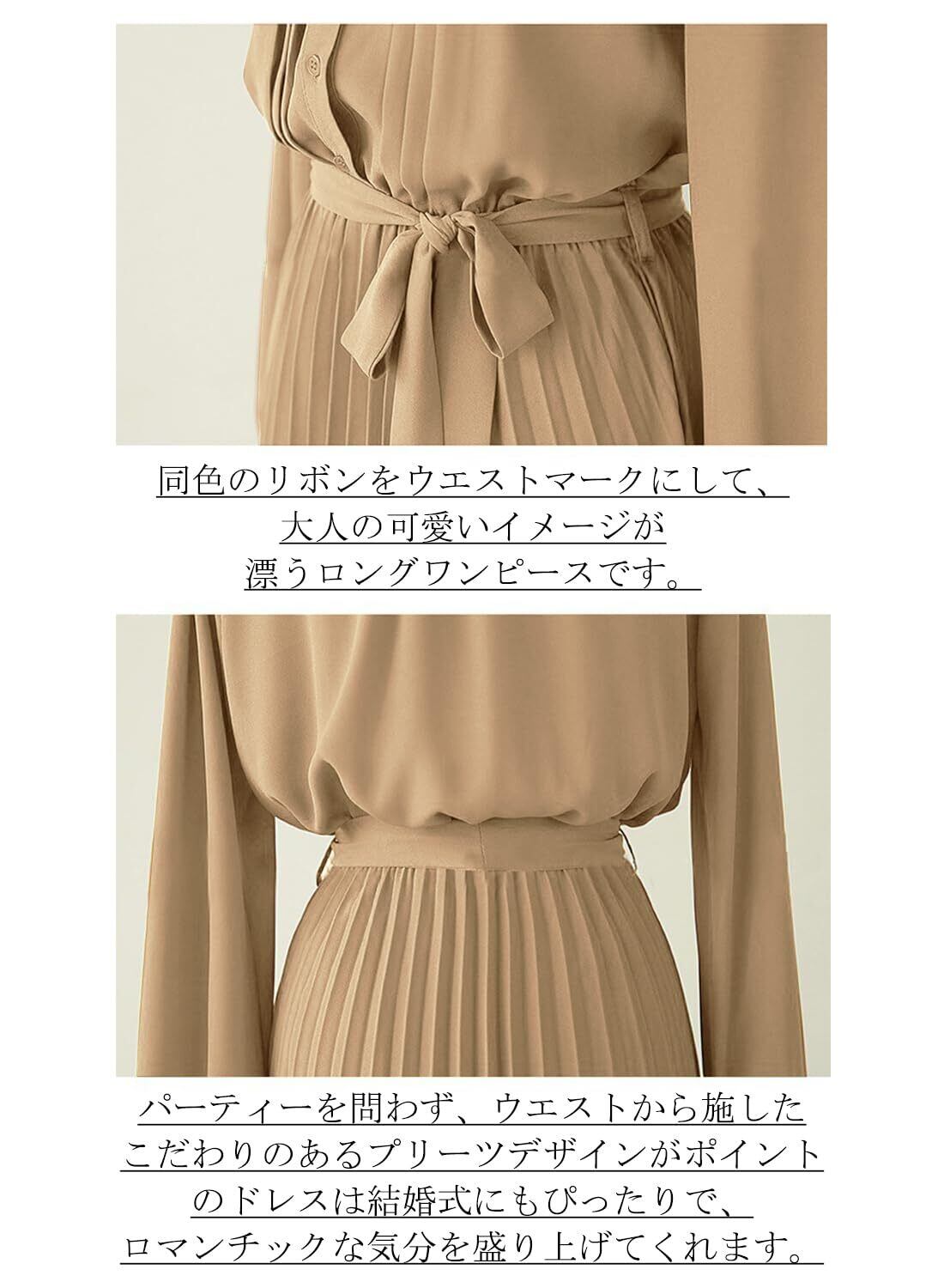 ➤ 特徴:プリーツデザイン、ウエストゴム、リボン付き、タック、長袖、ロング丈