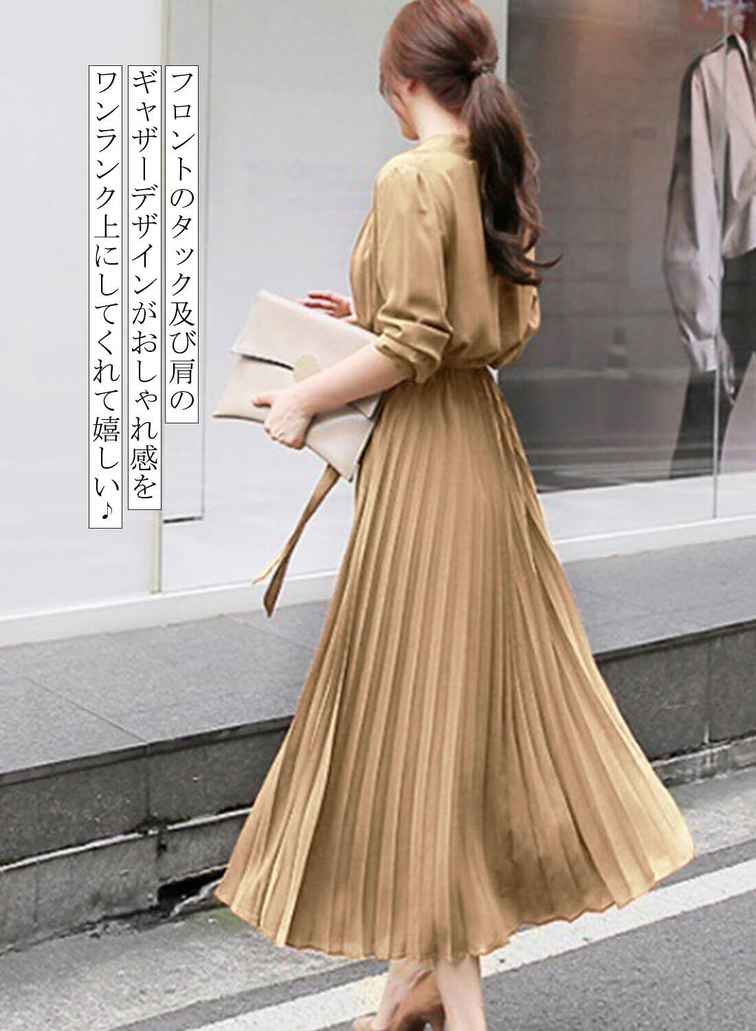 [Sueeya] スイーヤ ロング ワンピース プリーツ レディース シャツワンピース ウエストゴム リボン タック 可愛い 着痩せ おしゃれ エレガント 通勤 結婚式 パーティー ドレス 春 秋 冬