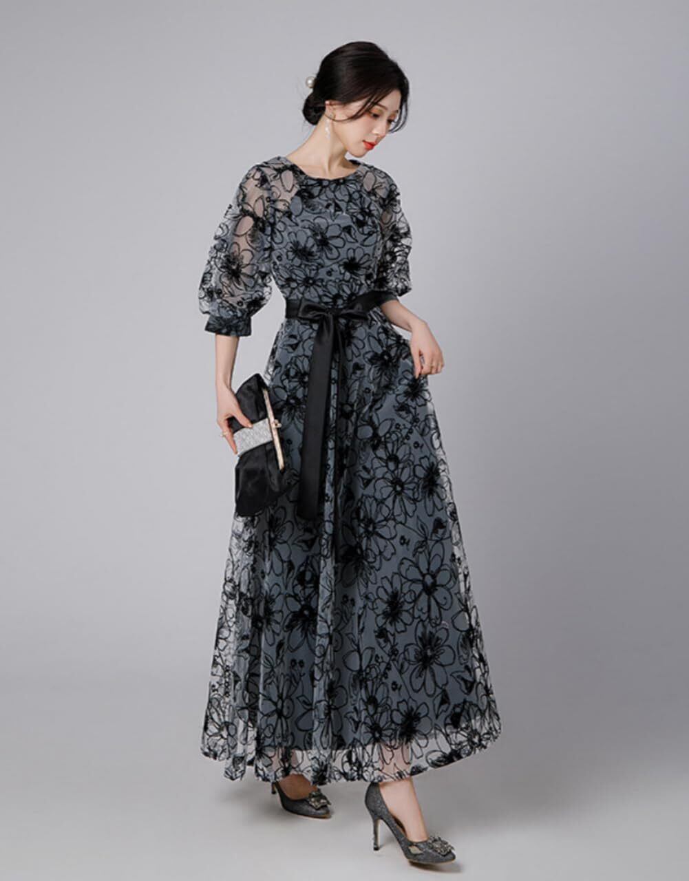 [大人かわいいデザイン] 上品なロング丈のおしゃれなパーティーワンピース。 全体に施された花柄刺繍が新鮮でヘルシーな印象に。また脚長効果の高いリボンベルトも付属しています。トップスと袖部分には、シースルーで華やかな席にもぴったりな大人フェミニンなディテール。さり気なく体型カバーを叶え、優しい印象を後押ししてくれる技ありデザイン。きちんと感は欲しいけど、地味見えはイヤ、という方にぴったりなオケージョンドレス。