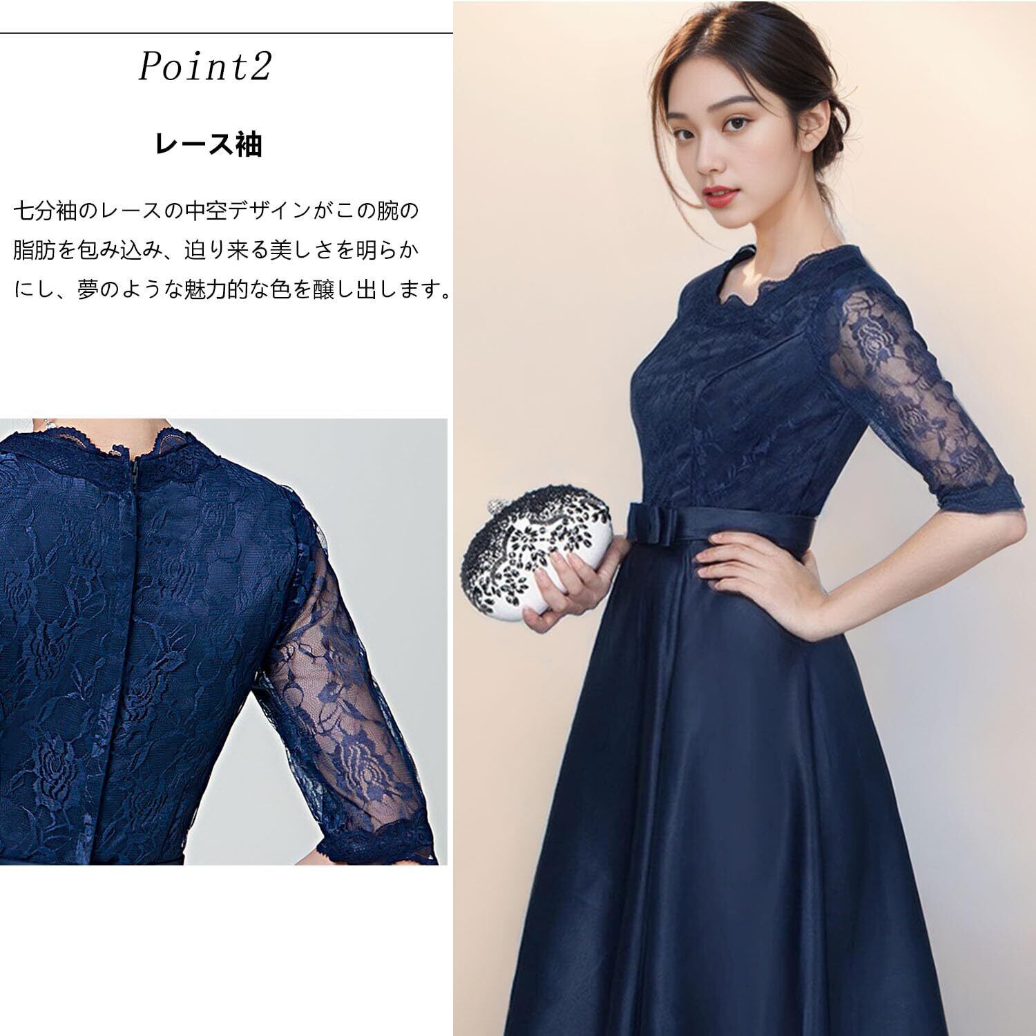この美しいロングドレスは、七分袖とレース切り替えデザインが特徴で、女性らしい魅力を引き立てます。シフォン素材が柔らかく流れるように揺れ動き、結婚式や二次会、お呼ばれのシーンでの主役になること間違いなしです。上品さを求める大人の女性にぴったりな一着です。