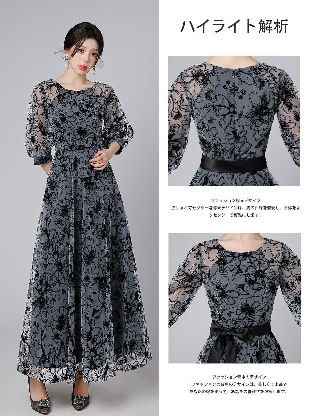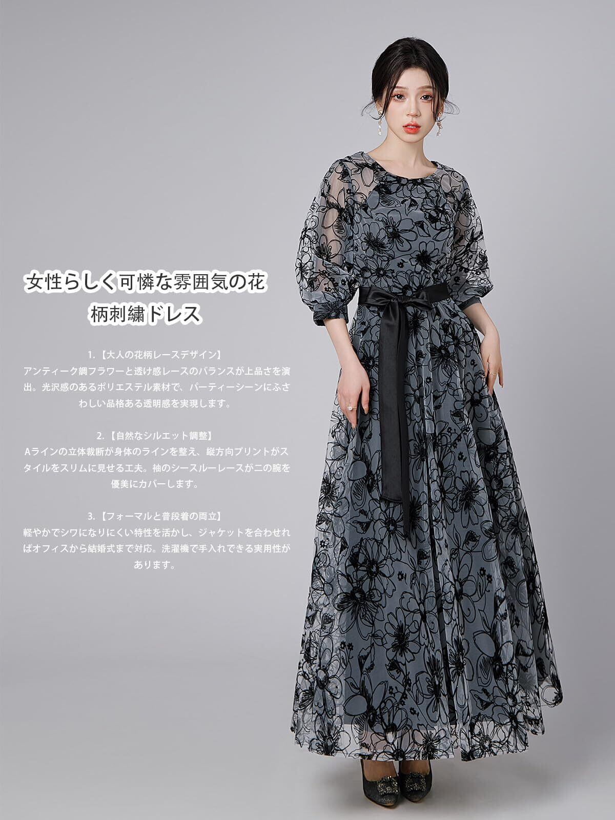 この素敵なロング丈ドレスは、エレガントなレースと花柄デザインが特徴です。長袖のスタイルは、フォーマルな結婚式や二次会、卒入式、そして宴会イブニングにぴったり。大きいサイズの展開もあるため、あらゆる体型の方にご愛用いただけます。