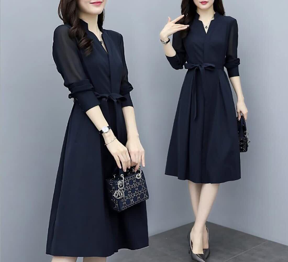➤ 特徴:Vネック、長袖、ベルト付き、Aライン、ミモレ丈
