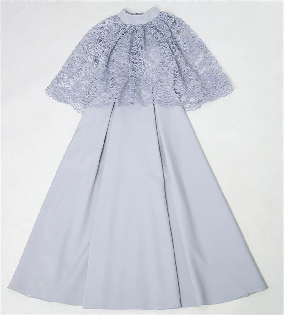 ➤ 特徴:ハイネック、レースケープ風、Aライン、ロングドレス