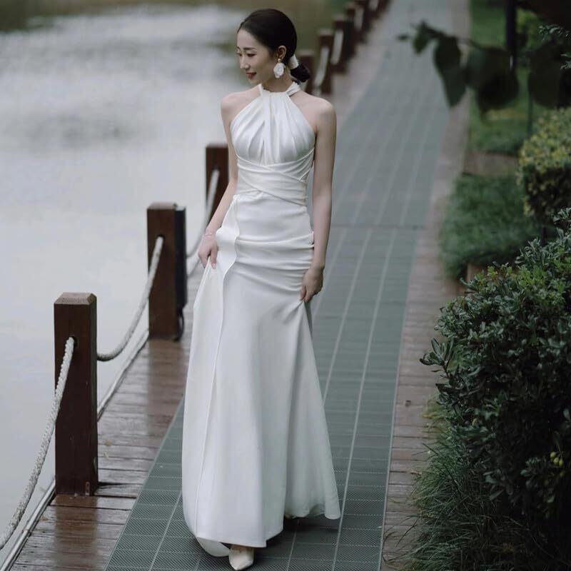 [TRVELBETT] ウェディングドレス 二次会 ホルターネック サテン 白 オシャレ ロングドレス Aライン 着痩せ 結婚式 二次会 ノースリーブ 森系 花嫁 無地 海外挙式 撮影 XS S M L XL XXL