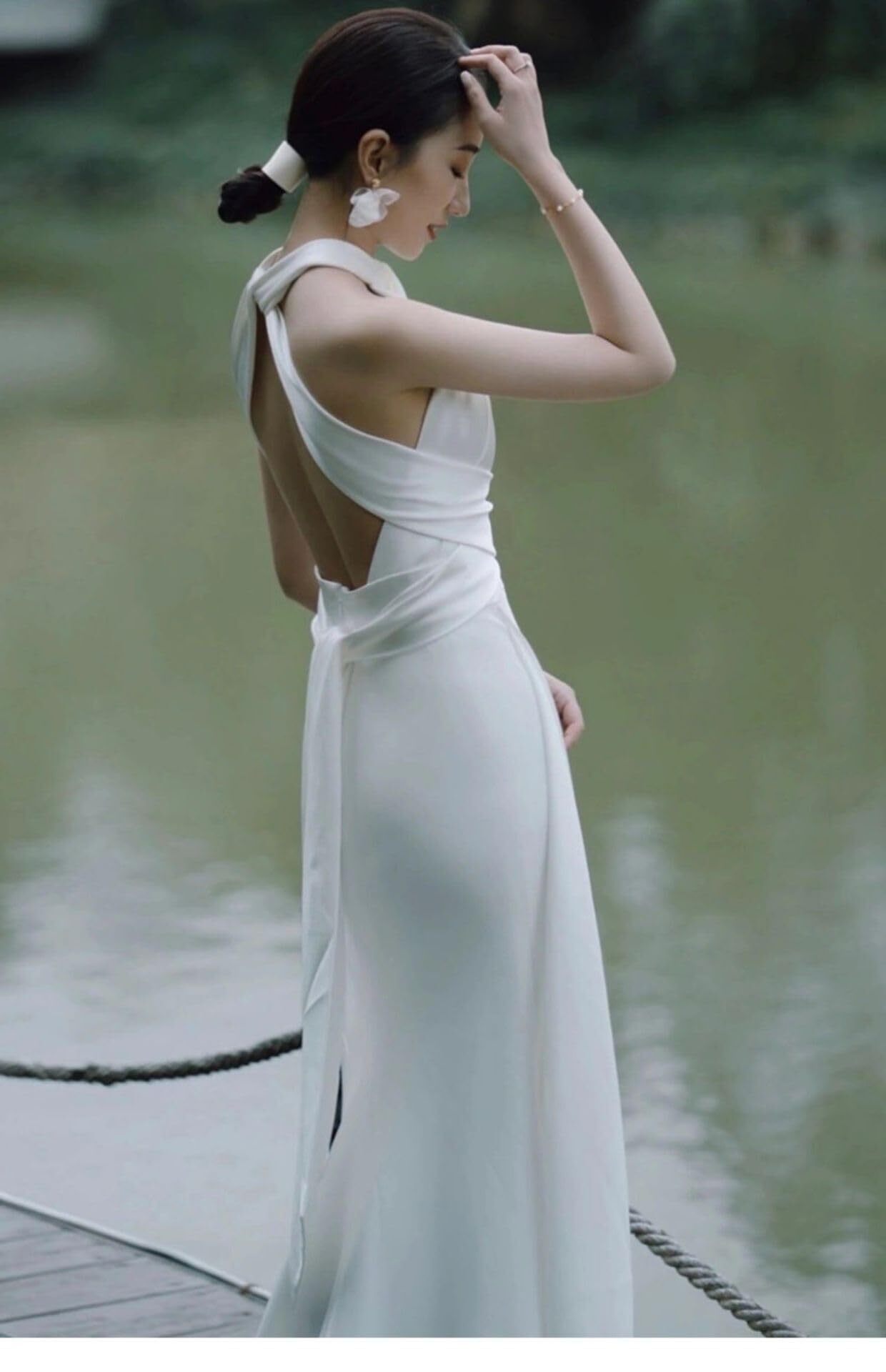 ➤ 特徴:ホルターネック、Aライン、ロング丈、ノースリーブ(森系スタイル)、サテン素材