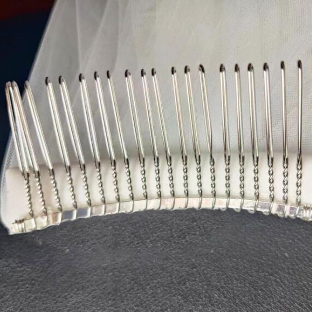 金属製のコームが付いたベールは、髪にしっかりと固定できます。とても柔らかいチュールと丈夫なコームで、頭のどこに付けてもしっかりと固定されます。エレガントでシンプルなこのウェディングベールは、どんなウェディングドレスにもマッチします。