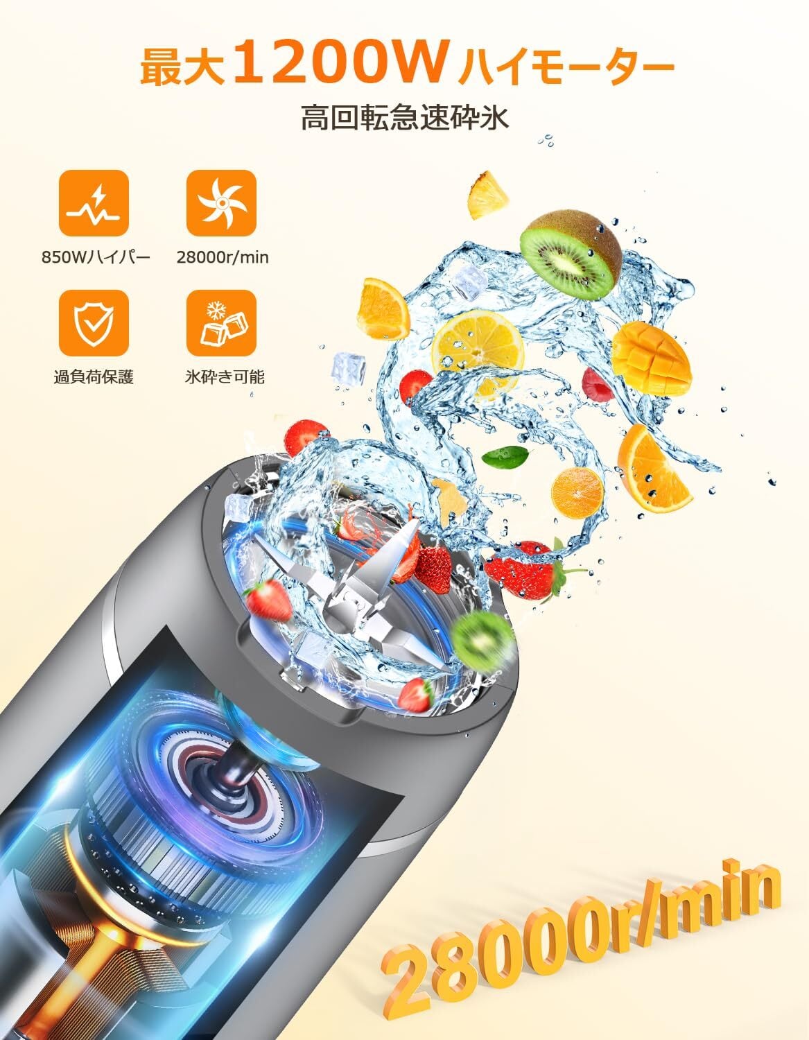 ➤ 特徴:最大1200W、6枚刃、氷砕き可能、水洗い対応、過熱保護