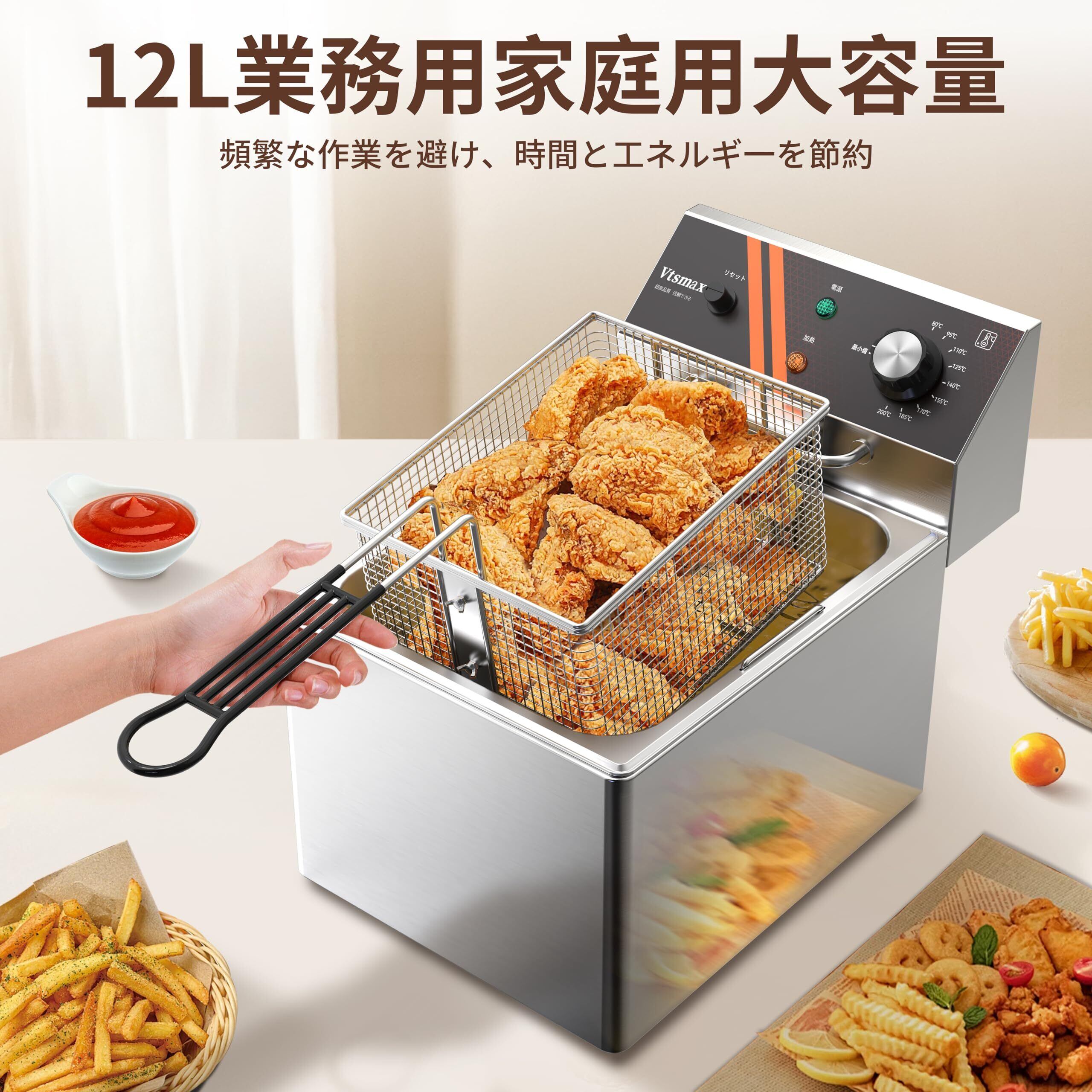 ステンレス電気フライヤー 業務用 12L大容量卓上フライヤー家庭用 60-200℃温度調節 304ステンレス油槽 フライバスケット付き 揚げ物や 天ぷら 唐揚げ等にディープフライヤー 100V