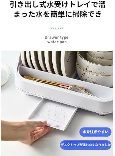 【食器収納】:内部には複数の排水穴があり、食器の水を簡単に排水でき、下部には引き出し式の水収集トレイがあり、水を注ぐのに便利です。カバーには通気孔もあり、湿気やカビを効果的に防ぎます。