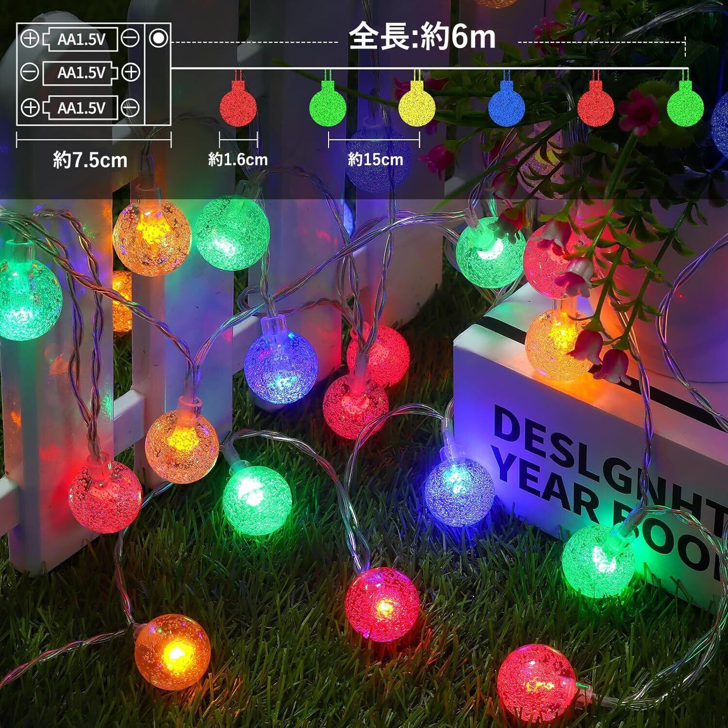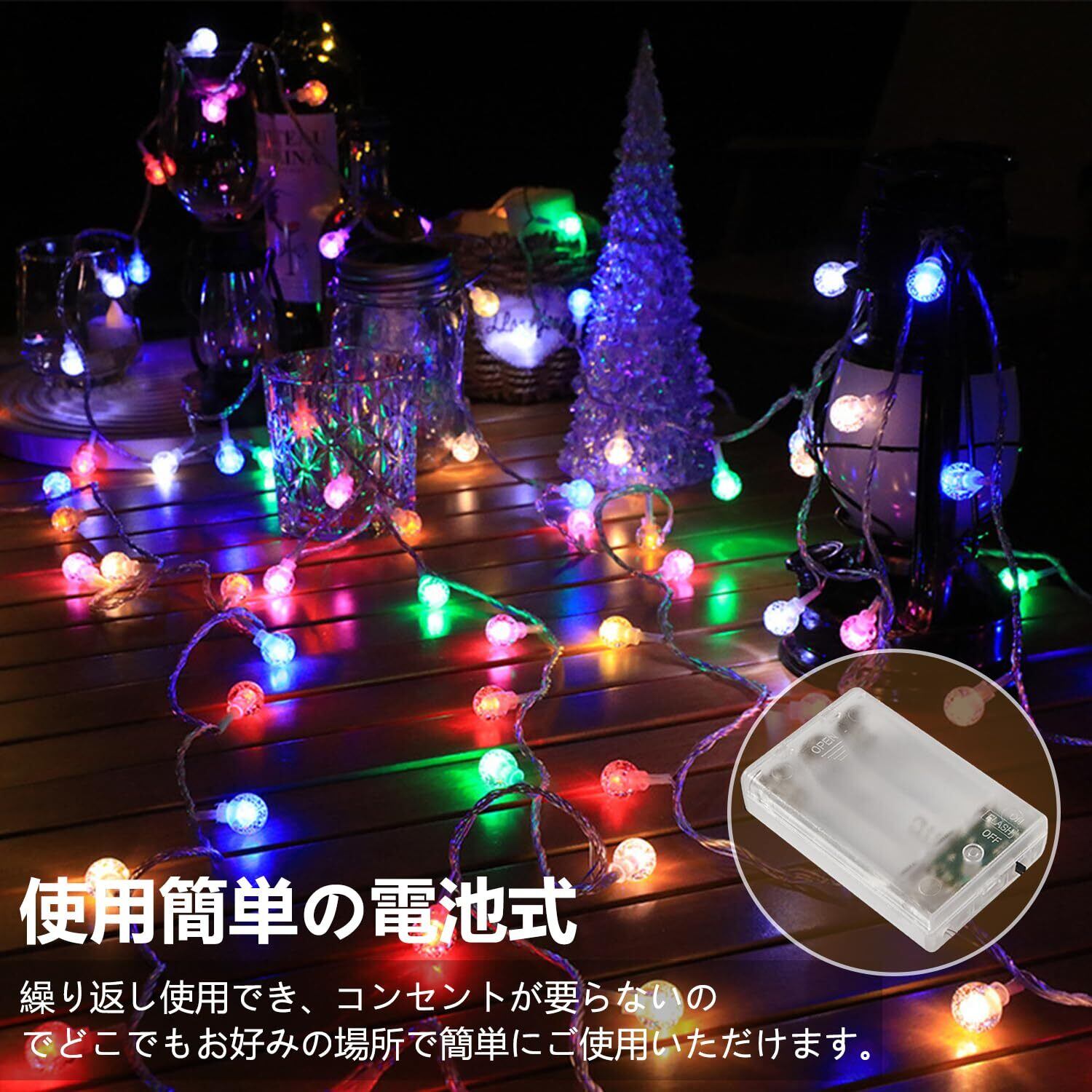 全長6M、40LED電球、マルチカラー、点滅/点灯切替、電池式、屋内・屋外使用可能