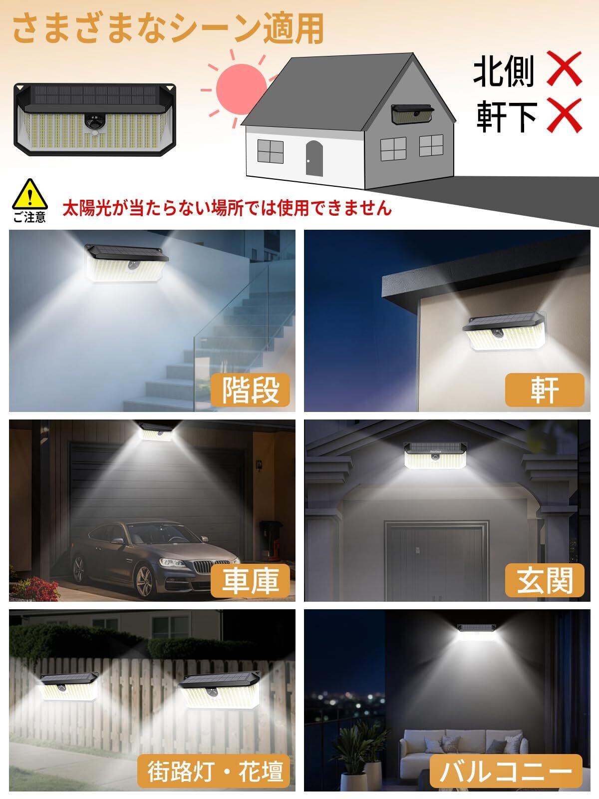 1【高輝度で安心の防犯対策】このソーラーライトは4000ルーメンの高輝度を誇り、466個のLEDが3面から発光します。夜間のセキュリティを強化し、自宅や庭の暗い部分を明るく照らします。防犯対策として非常に効果的で、安心感を提供します!