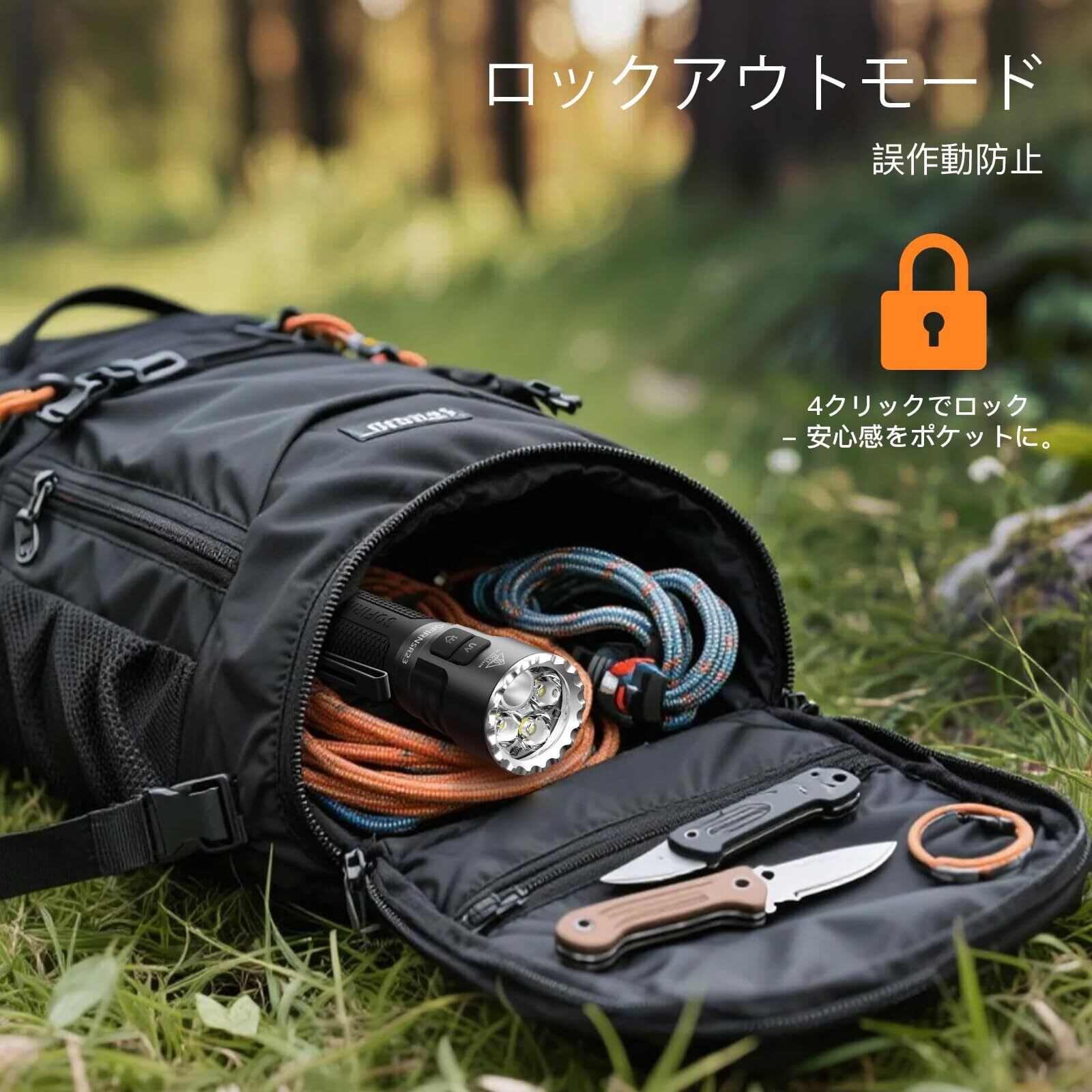 ロックアウトモード:ポケットやバッグの中で誤って点灯するのを防ぎます。白いボタンを4回クリックするだけでロックでき、安心して持ち運ぶことができます。