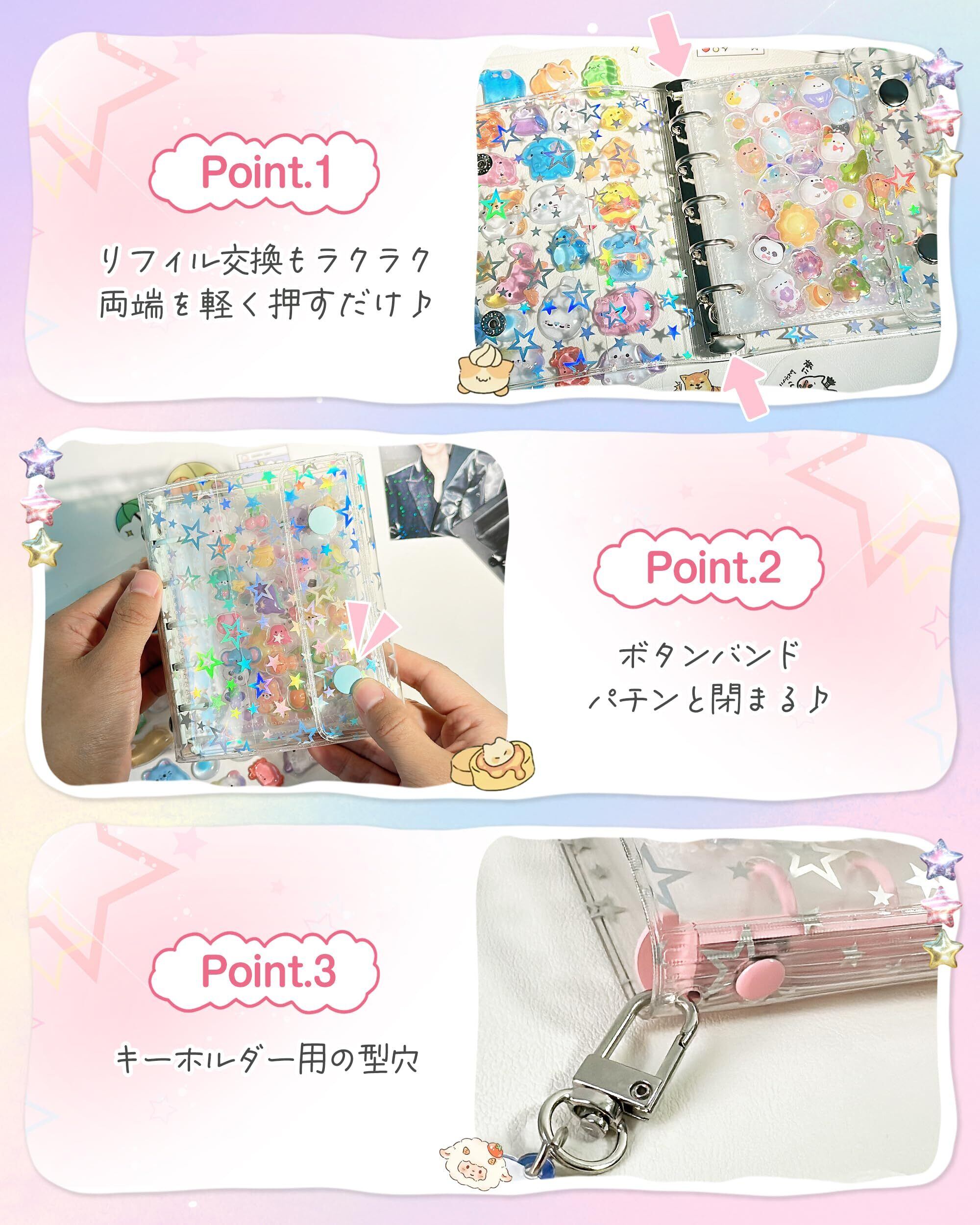 【M5サイズ シール帳バインダー】 セット内容:❶バインダー本体 ❷カードポケットリフィル(3層構造/プラスチックシート)×20枚 ❸チャック付きボケット×2枚 ❹下敷き×2枚。内寸約6.0cm×10.5cmのカードスリーブで、各種トレカや写真をしっかり収納、バインダーに穴のないカードや写真を追加できます。本体サイズ(約):縦12.5㎝×横10.5㎝×厚み2.5㎝。ホログラム加工の星柄が散りばめられたクリアバインダーは、光の角度によってキラキラと輝きます。お気に入りのシールやコレクションがより可愛い、"キラキラ輝く見せる!