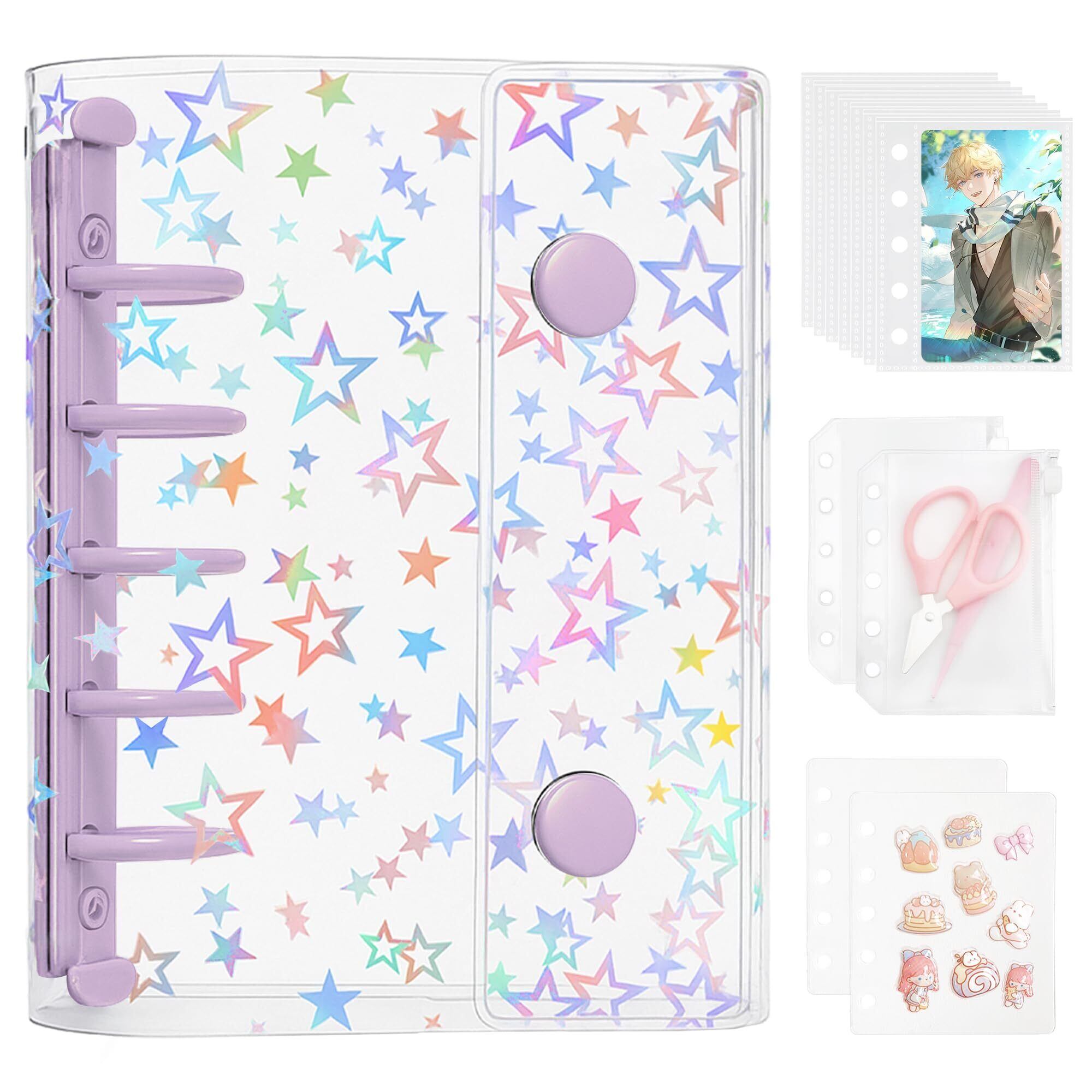 透明バインダー シール手帳 プラバン M5サイズ ミニ 【バインダー×1個 リフィル×20枚 チャック付きボケット×2枚 下敷き×2枚】3層構造PPシート カードポケット シール台紙 クリア 手帳 プリ帳 カードスリーブ 透明シール帳 はがせる ポケットサイズ シール 女の子 星柄タイプ パープル