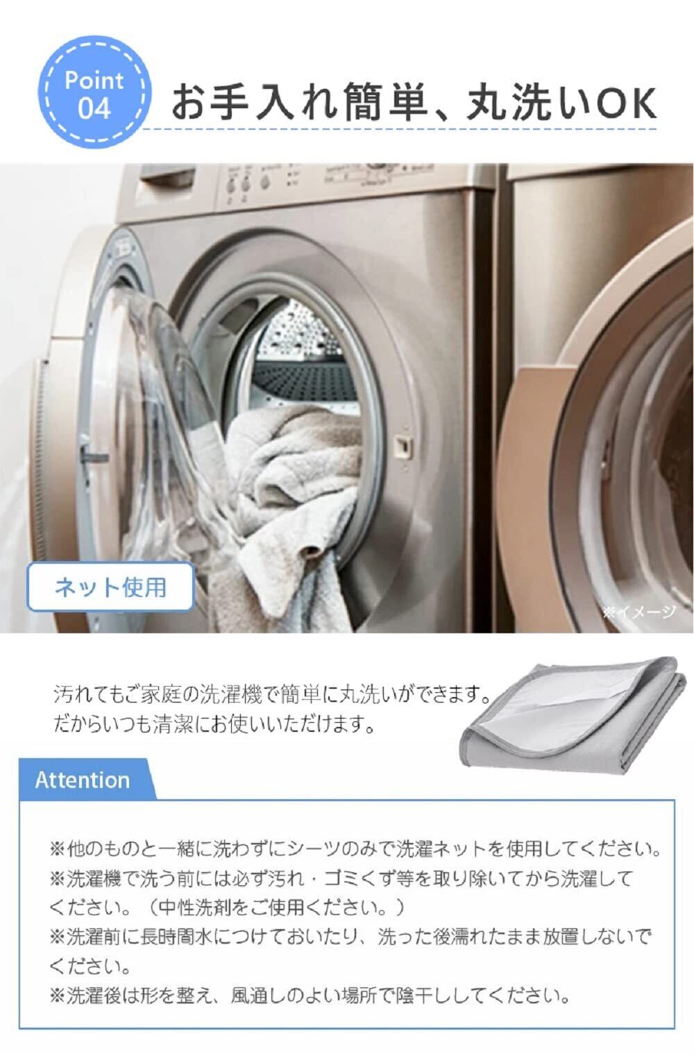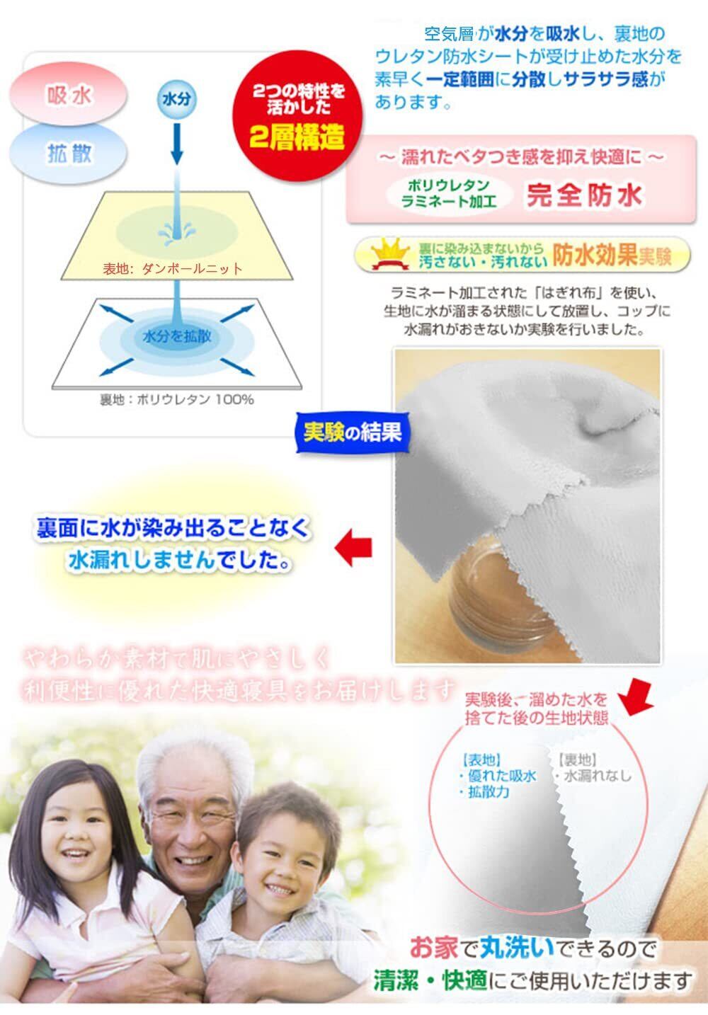 【丸洗いOK】ご自宅の洗濯機で丸洗い可能、いつでも清潔に使えます。おねしょの後処理や衛生面でも大助かります。水流を「弱」にし「洗濯ネット」をご使用ください。防水素材なので、シーツは完全に脱水できません。※乾燥機は使用しないでください。 ※電気毛布など熱源のあるものとの併用不可です。