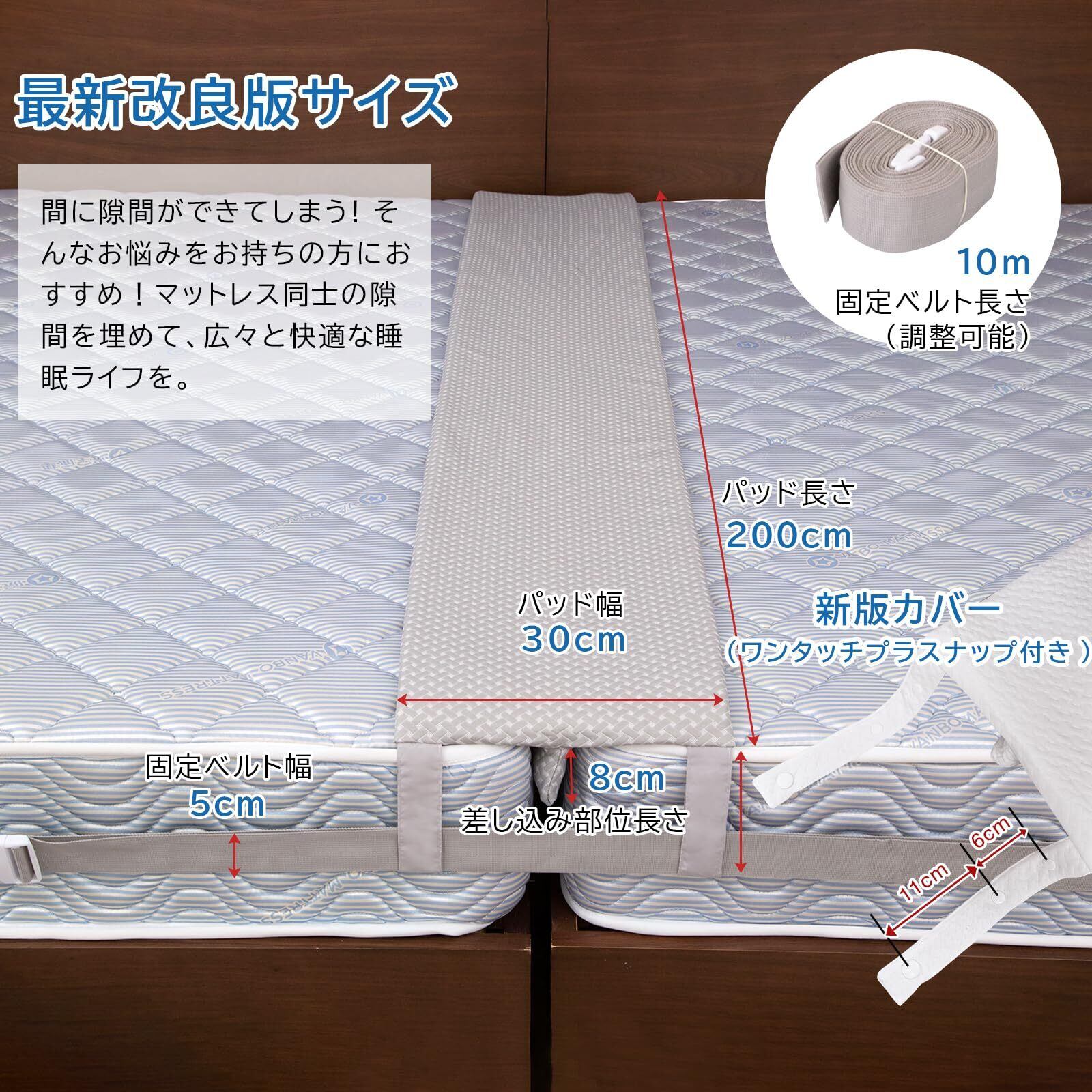 すきまパッド マットレスバンド ベッド隙間パッド マットレスパッド 隙間スペーサー 洗濯カバー付き ベッドすきま埋めパッド 隙間埋め ズレ防止 ベッド連結固定 幅30cm 2つ接続ベルト 新設計 ワンタッチプラスナップ付き 着脱簡単 ベッド隙間 ベルト10m 200*30*10cm グレー (セット)