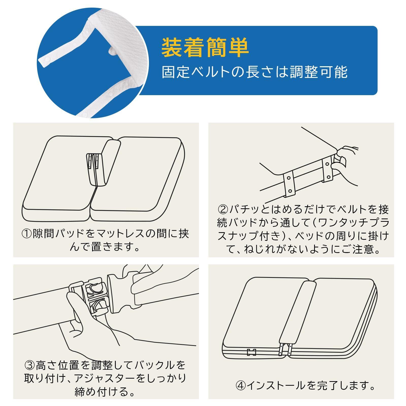 【高品質素材】隙間スペーサーの表面はやわらかくサラッと心地のよい肌ざわりと感じます。子様のいるご家庭でも安心してお使いいただけます。「緩みにくい」を目標に作られたマットレスベルトは素材のツヤを抑えることで従来より滑りにくく、またバックルを軽量化することで垂れ下がりにくくなりました。パッドの幅を30cmと広いサイズのパッドを採用しました。パッドの浮き沈み、位置ずれを軽減します。