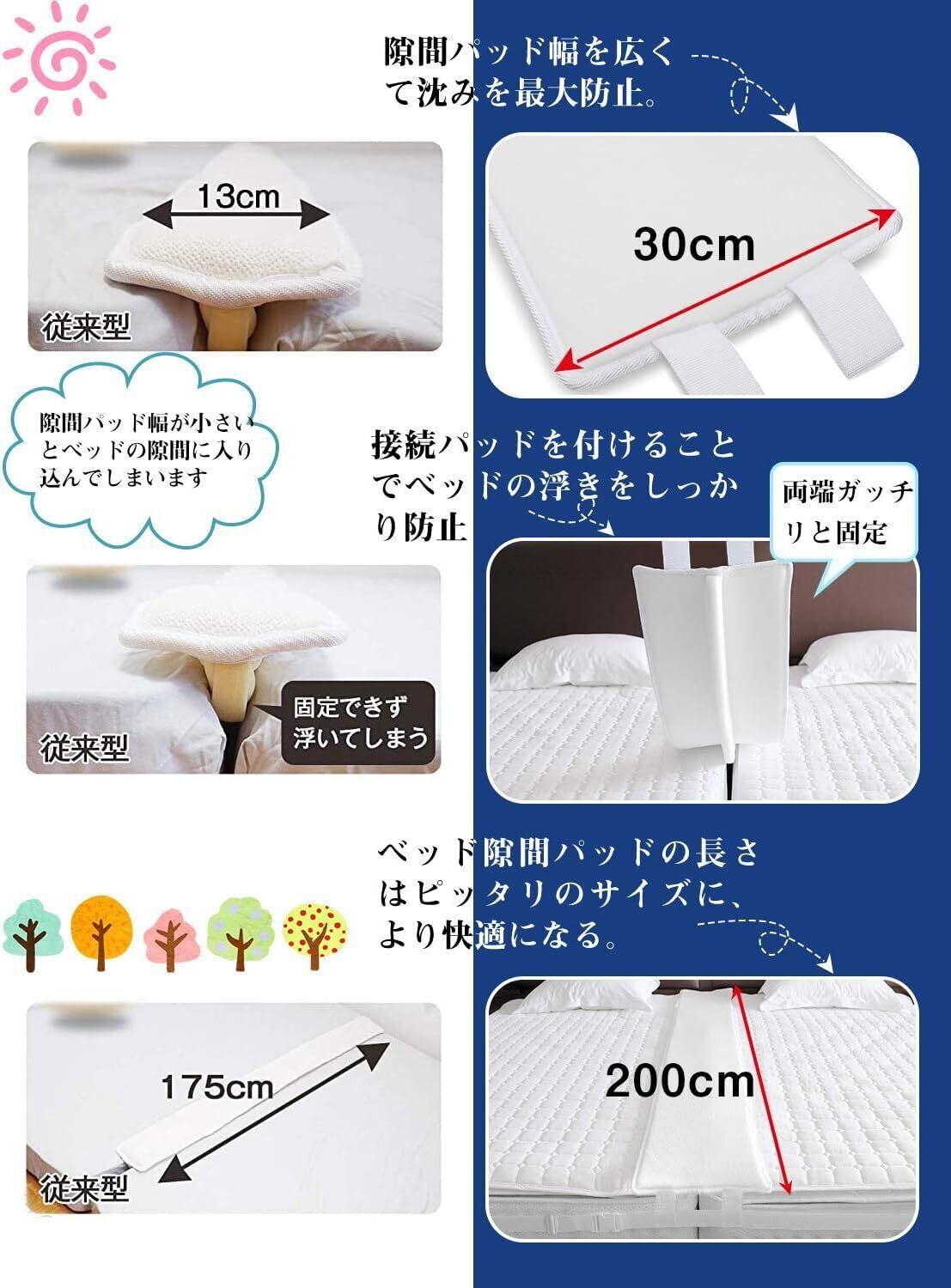 【ワイド幅30cm & 2つ接続ベルト】隙間パッドが隙間に埋まらないように、この隙間パッドの落下防止帯を一つから二つに改良しました。それに、収納袋付き、もっと便利になっています。マットレス固定バンドも3cmから5cmに改良します。3段の溝がベッドからのずれを防ぎます。