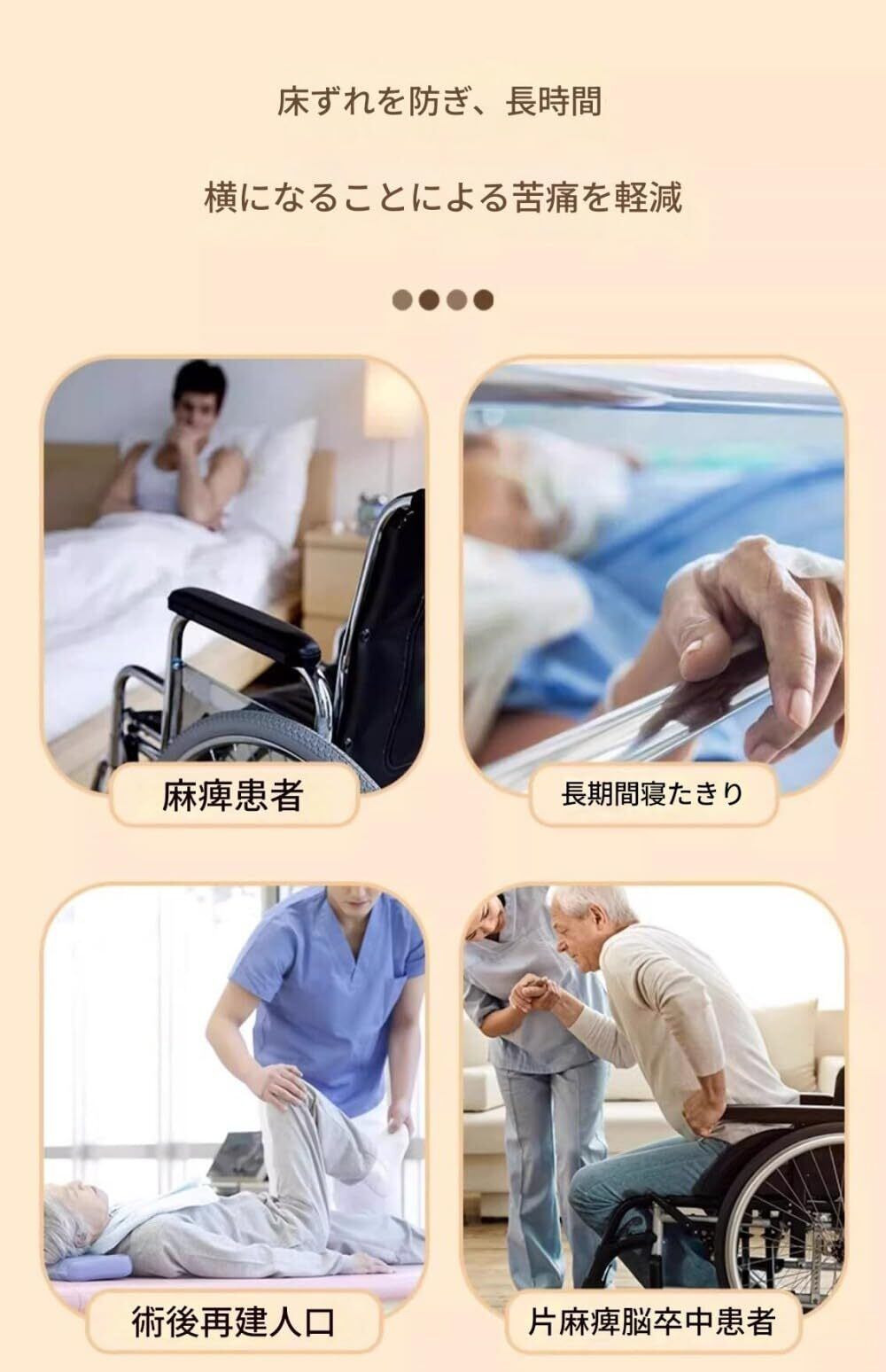 これは長期的寝床にの患者と体が寝返りにくい患者に最適。家用、病院、老人ホーム、母乳育児等にも使えます。難しいな取り付け等がないので、ベッドに置くだけ使えます。便利です。大小のほぼすべての構造物に適合します。褥瘡予防