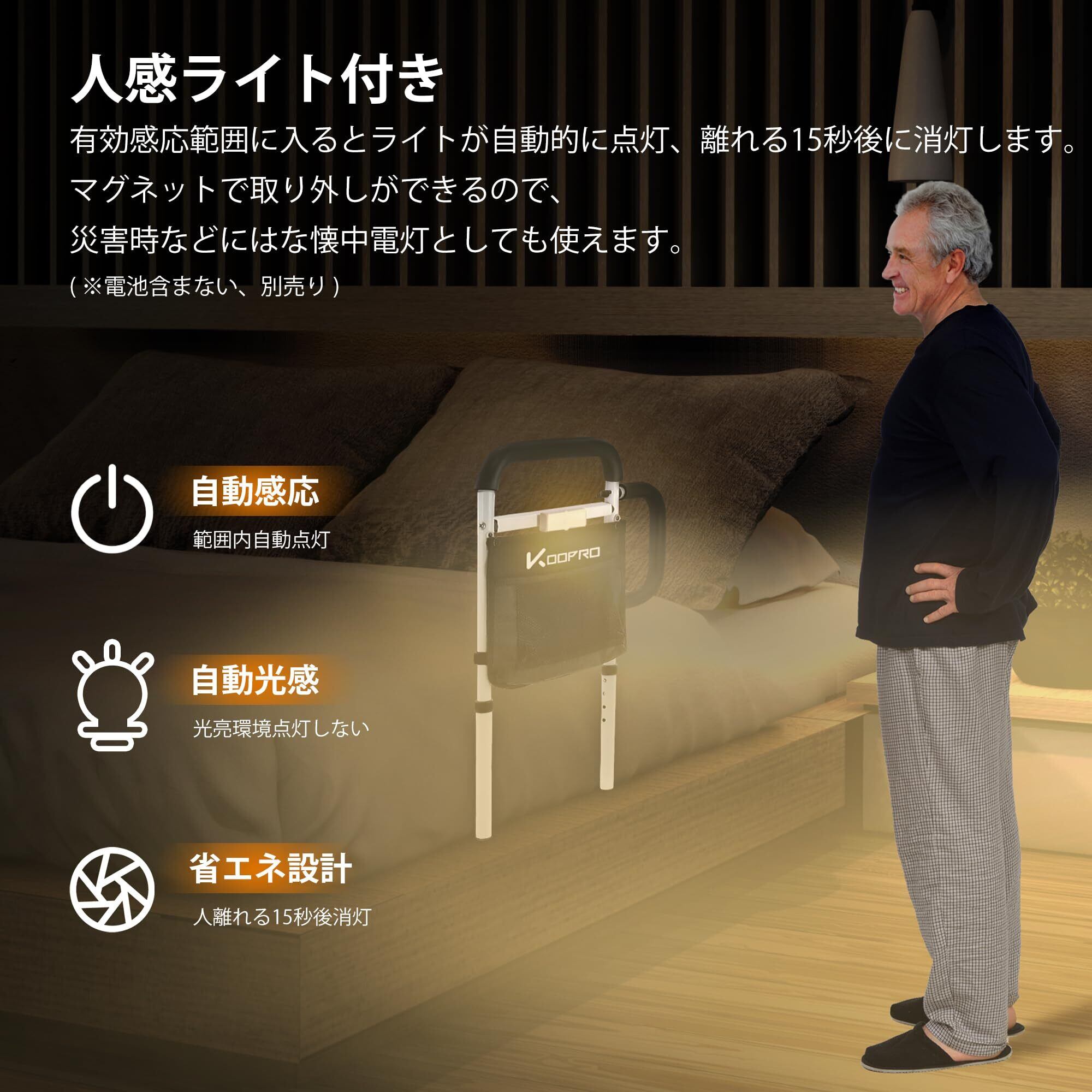 1【安心と快適さを提供する新しいベッドガード!】この「KOOPROベッドガード」は、特に高齢者や身体に不安を抱える方に最適なアイテムです。人感センサーライトが付いており、夜間の起き上がりもサポートし、安心してお休みいただけます!