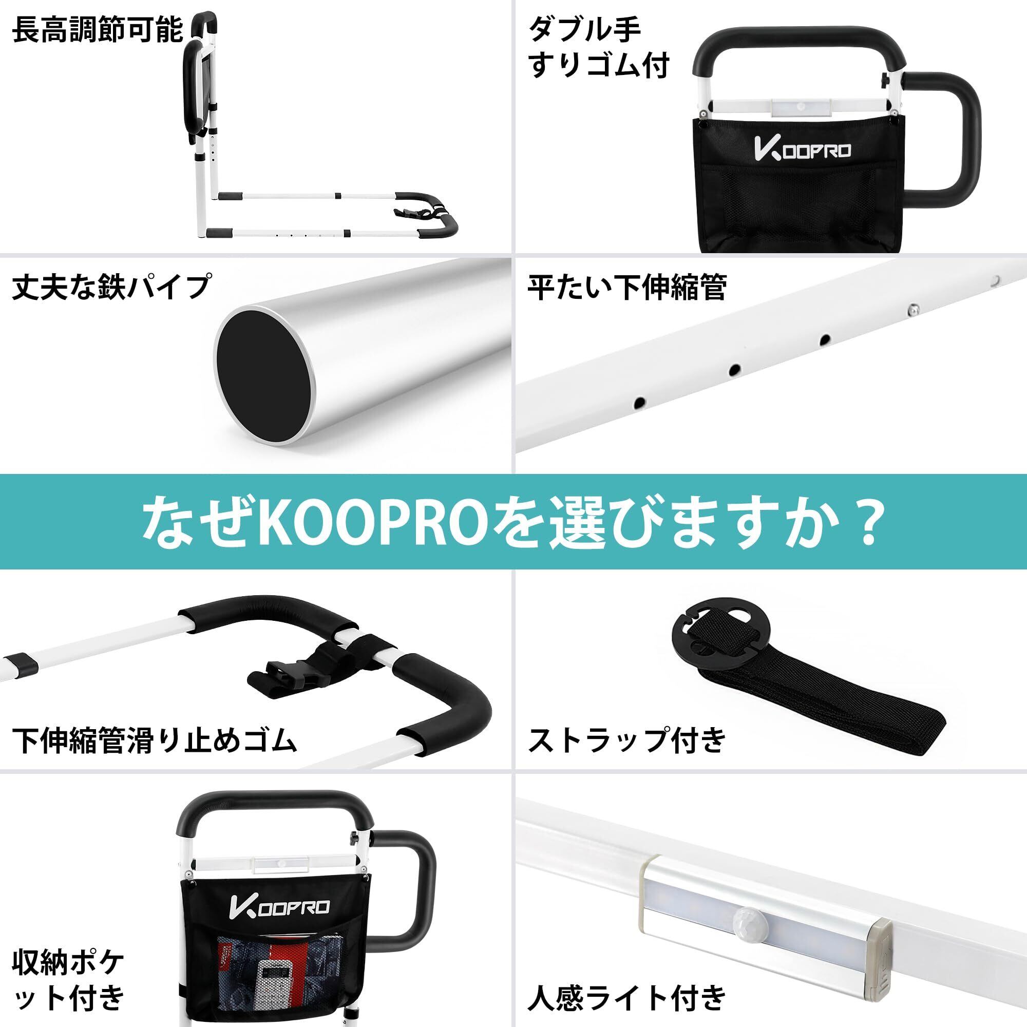 KOOPRO 2025年新登場人感センサーライト付き ベッドガード ダブル手すり 5段長さ 4段高さ調節可能 転落防止 柵 立ち上がり補助器具 ベルト 小物整理バッグ付き 安定性 丈夫 大人 高齢者 介護用 組立簡単 日本語説明書付き