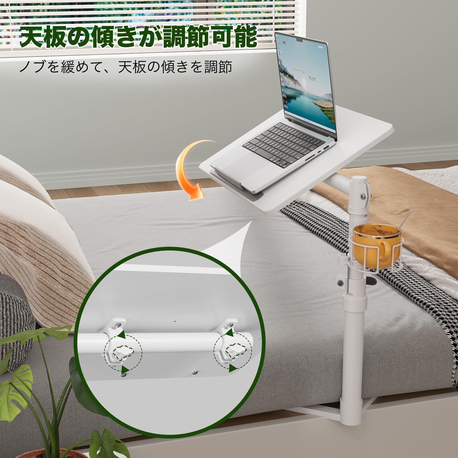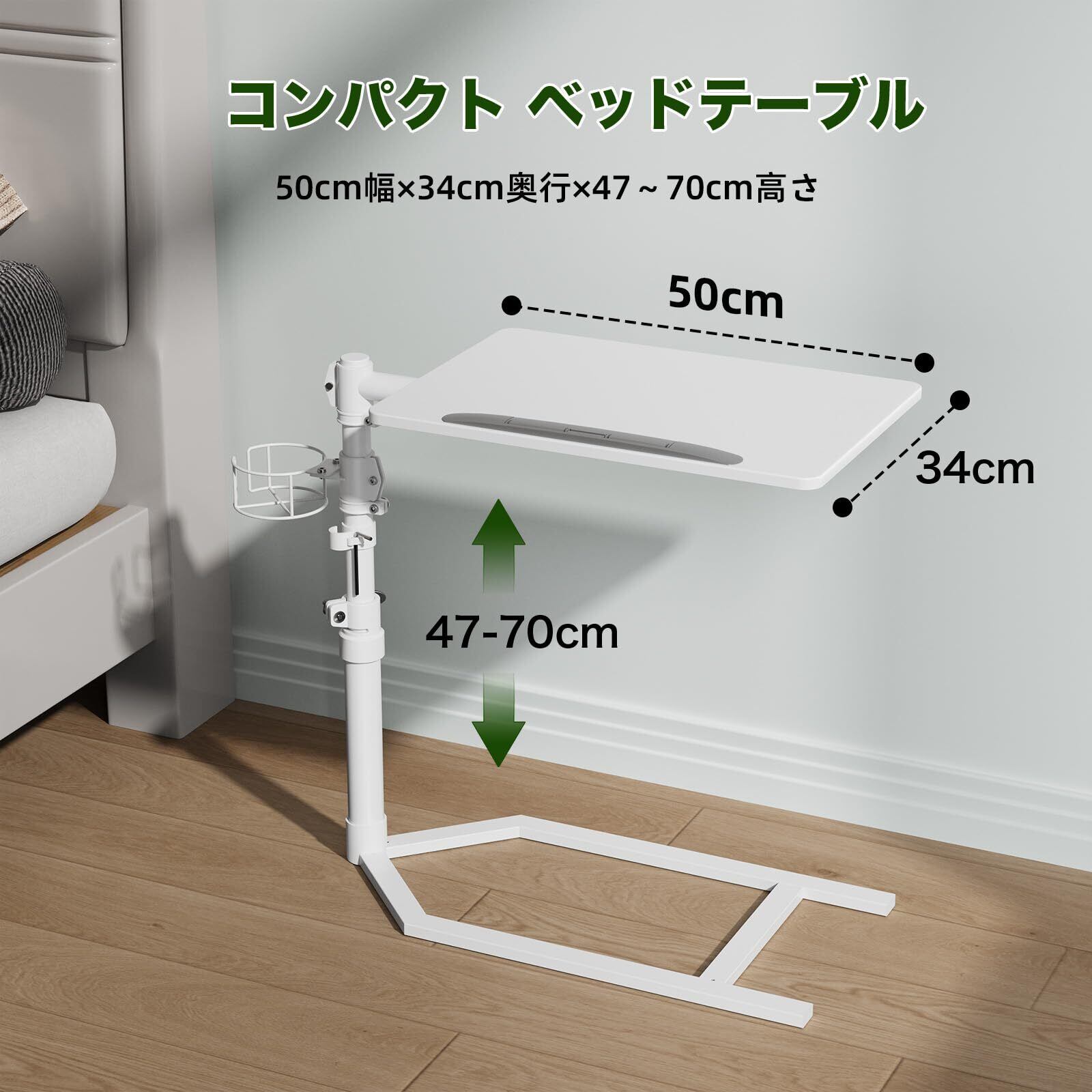 ベッドテーブル 昇降 角度調節可能 天板360°回転 幅50×奥行34cm 高さ47~70cm 耐荷重8kg コンパクト サイドテーブル カップホルダー付き ケーブルクリップ付き 転落防止機構 介護テーブル 縁フレームなしのロフトベッド&ソファ用 ホワイト 白