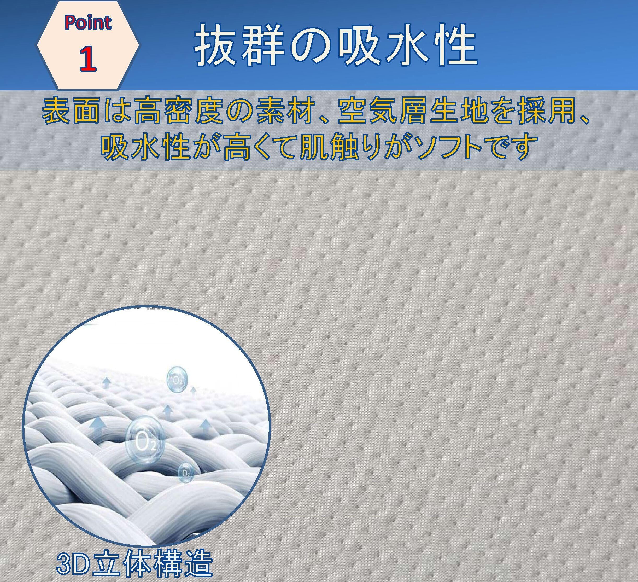 【表面は空気層生地】介護用防水シーツ ナイロン100%の空気層生地と中綿には抗菌防臭加工を施したポリエステル100%を使用。敷きパッドは吸水性・速乾性に優れ、速くに汗を吸収して乾かし快適な眠りを約束する3D立体構造で、一晩中サラッとした寝心地を提供します。